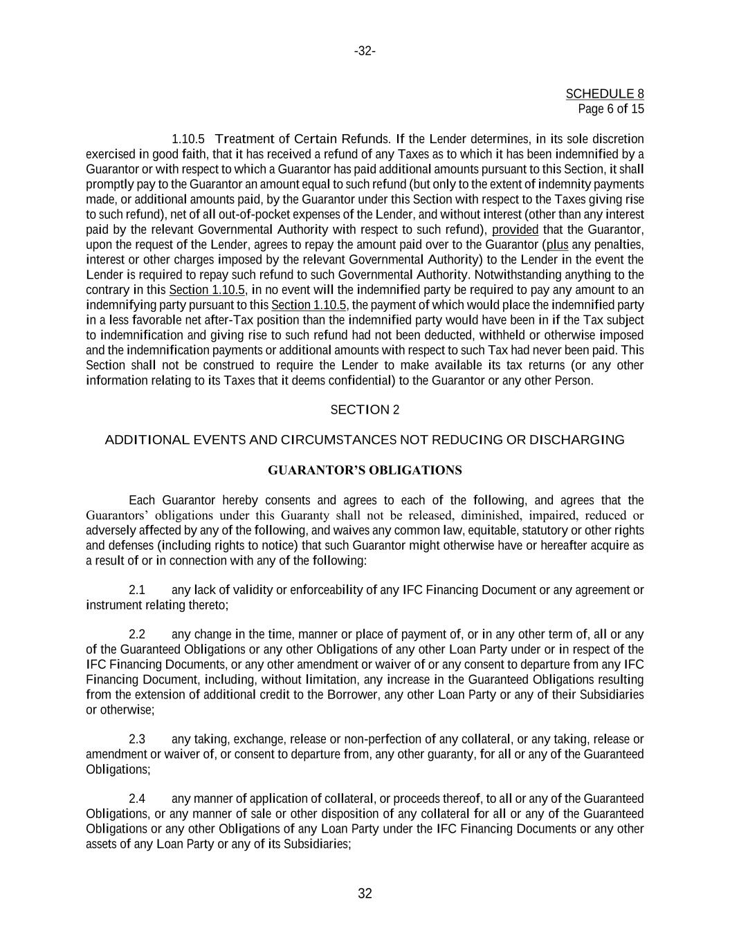 -32- 32 SCHEDULE 8 Page 6 of 15 1.10.5 Treatment of Certain Refunds. If the Lender determines, in its sole discretion exercised in good faith, that it has received a refund of any Taxes as to which it has been indemnified by a Guarantor or with respect to which a Guarantor has paid additional amounts pursuant to this Section, it shall promptly pay to the Guarantor an amount equal to such refund (but only to the extent of indemnity payments made, or additional amounts paid, by the Guarantor under this Section with respect to the Taxes giving rise to such refund), net of all out-of-pocket expenses of the Lender, and without interest (other than any interest paid by the relevant Governmental Authority with respect to such refund), provided that the Guarantor, upon the request of the Lender, agrees to repay the amount paid over to the Guarantor (plus any penalties, interest or other charges imposed by the relevant Governmental Authority) to the Lender in the event the Lender is required to repay such refund to such Governmental Authority. Notwithstanding anything to the contrary in this Section 1.10.5, in no event will the indemnified party be required to pay any amount to an indemnifying party pursuant to this Section 1.10.5, the payment of which would place the indemnified party in a less favorable net after-Tax position than the indemnified party would have been in if the Tax subject to indemnification and giving rise to such refund had not been deducted, withheld or otherwise imposed and the indemnification payments or additional amounts with respect to such Tax had never been paid. This Section shall not be construed to require the Lender to make available its tax returns (or any other information relating to its Taxes that it deems confidential) to the Guarantor or any other Person. SECTION 2 ADDITIONAL EVENTS AND CIRCUMSTANCES NOT REDUCING OR DISCHARGING GUARANTOR’S OBLIGATIONS Each Guarantor hereby consents and agrees to each of the following, and agrees that the Guarantors’ obligations under this Guaranty shall not be released, diminished, impaired, reduced or adversely affected by any of the following, and waives any common law, equitable, statutory or other rights and defenses (including rights to notice) that such Guarantor might otherwise have or hereafter acquire as a result of or in connection with any of the following: 2.1 any lack of validity or enforceability of any IFC Financing Document or any agreement or instrument relating thereto; 2.2 any change in the time, manner or place of payment of, or in any other term of, all or any of the Guaranteed Obligations or any other Obligations of any other Loan Party under or in respect of the IFC Financing Documents, or any other amendment or waiver of or any consent to departure from any IFC Financing Document, including, without limitation, any increase in the Guaranteed Obligations resulting from the extension of additional credit to the Borrower, any other Loan Party or any of their Subsidiaries or otherwise; 2.3 any taking, exchange, release or non-perfection of any collateral, or any taking, release or amendment or waiver of, or consent to departure from, any other guaranty, for all or any of the Guaranteed Obligations; 2.4 any manner of application of collateral, or proceeds thereof, to all or any of the Guaranteed Obligations, or any manner of sale or other disposition of any collateral for all or any of the Guaranteed Obligations or any other Obligations of any Loan Party under the IFC Financing Documents or any other assets of any Loan Party or any of its Subsidiaries;