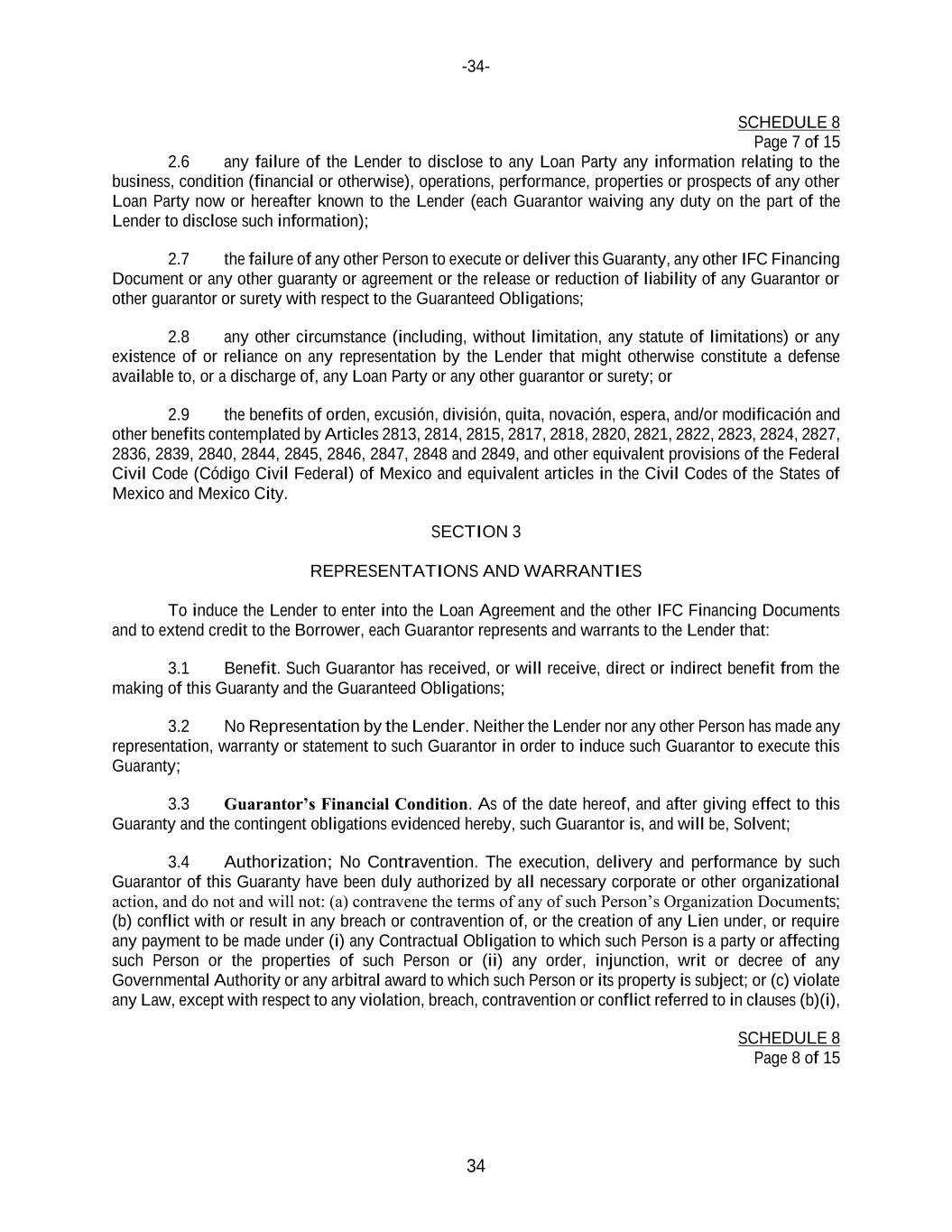 -34- 34 SCHEDULE 8 Page 7 of 15 2.6 any failure of the Lender to disclose to any Loan Party any information relating to the business, condition (financial or otherwise), operations, performance, properties or prospects of any other Loan Party now or hereafter known to the Lender (each Guarantor waiving any duty on the part of the Lender to disclose such information); 2.7 the failure of any other Person to execute or deliver this Guaranty, any other IFC Financing Document or any other guaranty or agreement or the release or reduction of liability of any Guarantor or other guarantor or surety with respect to the Guaranteed Obligations; 2.8 any other circumstance (including, without limitation, any statute of limitations) or any existence of or reliance on any representation by the Lender that might otherwise constitute a defense available to, or a discharge of, any Loan Party or any other guarantor or surety; or 2.9 the benefits of orden, excusión, división, quita, novación, espera, and/or modificación and other benefits contemplated by Articles 2813, 2814, 2815, 2817, 2818, 2820, 2821, 2822, 2823, 2824, 2827, 2836, 2839, 2840, 2844, 2845, 2846, 2847, 2848 and 2849, and other equivalent provisions of the Federal Civil Code (Código Civil Federal) of Mexico and equivalent articles in the Civil Codes of the States of Mexico and Mexico City. SECTION 3 REPRESENTATIONS AND WARRANTIES To induce the Lender to enter into the Loan Agreement and the other IFC Financing Documents and to extend credit to the Borrower, each Guarantor represents and warrants to the Lender that: 3.1 Benefit. Such Guarantor has received, or will receive, direct or indirect benefit from the making of this Guaranty and the Guaranteed Obligations; 3.2 No Representation by the Lender. Neither the Lender nor any other Person has made any representation, warranty or statement to such Guarantor in order to induce such Guarantor to execute this Guaranty; 3.3 Guarantor’s Financial Condition. As of the date hereof, and after giving effect to this Guaranty and the contingent obligations evidenced hereby, such Guarantor is, and will be, Solvent; 3.4 Authorization; No Contravention. The execution, delivery and performance by such Guarantor of this Guaranty have been duly authorized by all necessary corporate or other organizational action, and do not and will not: (a) contravene the terms of any of such Person’s Organization Documents; (b) conflict with or result in any breach or contravention of, or the creation of any Lien under, or require any payment to be made under (i) any Contractual Obligation to which such Person is a party or affecting such Person or the properties of such Person or (ii) any order, injunction, writ or decree of any Governmental Authority or any arbitral award to which such Person or its property is subject; or (c) violate any Law, except with respect to any violation, breach, contravention or conflict referred to in clauses (b)(i), SCHEDULE 8 Page 8 of 15