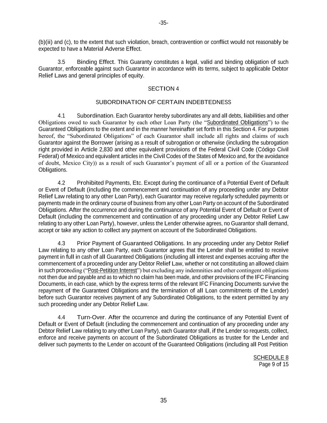 -35- 35 (b)(ii) and (c), to the extent that such violation, breach, contravention or conflict would not reasonably be expected to have a Material Adverse Effect. 3.5 Binding Effect. This Guaranty constitutes a legal, valid and binding obligation of such Guarantor, enforceable against such Guarantor in accordance with its terms, subject to applicable Debtor Relief Laws and general principles of equity. SECTION 4 SUBORDINATION OF CERTAIN INDEBTEDNESS 4.1 Subordination. Each Guarantor hereby subordinates any and all debts, liabilities and other Obligations owed to such Guarantor by each other Loan Party (the “Subordinated Obligations”) to the Guaranteed Obligations to the extent and in the manner hereinafter set forth in this Section 4. For purposes hereof, the “Subordinated Obligations” of each Guarantor shall include all rights and claims of such Guarantor against the Borrower (arising as a result of subrogation or otherwise (including the subrogation right provided in Article 2,830 and other equivalent provisions of the Federal Civil Code (Código Civil Federal) of Mexico and equivalent articles in the Civil Codes of the States of Mexico and, for the avoidance of doubt, Mexico City)) as a result of such Guarantor’s payment of all or a portion of the Guaranteed Obligations. 4.2 Prohibited Payments, Etc. Except during the continuance of a Potential Event of Default or Event of Default (including the commencement and continuation of any proceeding under any Debtor Relief Law relating to any other Loan Party), each Guarantor may receive regularly scheduled payments or payments made in the ordinary course of business from any other Loan Party on account of the Subordinated Obligations. After the occurrence and during the continuance of any Potential Event of Default or Event of Default (including the commencement and continuation of any proceeding under any Debtor Relief Law relating to any other Loan Party), however, unless the Lender otherwise agrees, no Guarantor shall demand, accept or take any action to collect any payment on account of the Subordinated Obligations. 4.3 Prior Payment of Guaranteed Obligations. In any proceeding under any Debtor Relief Law relating to any other Loan Party, each Guarantor agrees that the Lender shall be entitled to receive payment in full in cash of all Guaranteed Obligations (including all interest and expenses accruing after the commencement of a proceeding under any Debtor Relief Law, whether or not constituting an allowed claim in such proceeding (“Post-Petition Interest”) but excluding any indemnities and other contingent obligations not then due and payable and as to which no claim has been made, and other provisions of the IFC Financing Documents, in each case, which by the express terms of the relevant IFC Financing Documents survive the repayment of the Guaranteed Obligations and the termination of all Loan commitments of the Lender) before such Guarantor receives payment of any Subordinated Obligations, to the extent permitted by any such proceeding under any Debtor Relief Law. 4.4 Turn-Over. After the occurrence and during the continuance of any Potential Event of Default or Event of Default (including the commencement and continuation of any proceeding under any Debtor Relief Law relating to any other Loan Party), each Guarantor shall, if the Lender so requests, collect, enforce and receive payments on account of the Subordinated Obligations as trustee for the Lender and deliver such payments to the Lender on account of the Guaranteed Obligations (including all Post Petition SCHEDULE 8 Page 9 of 15