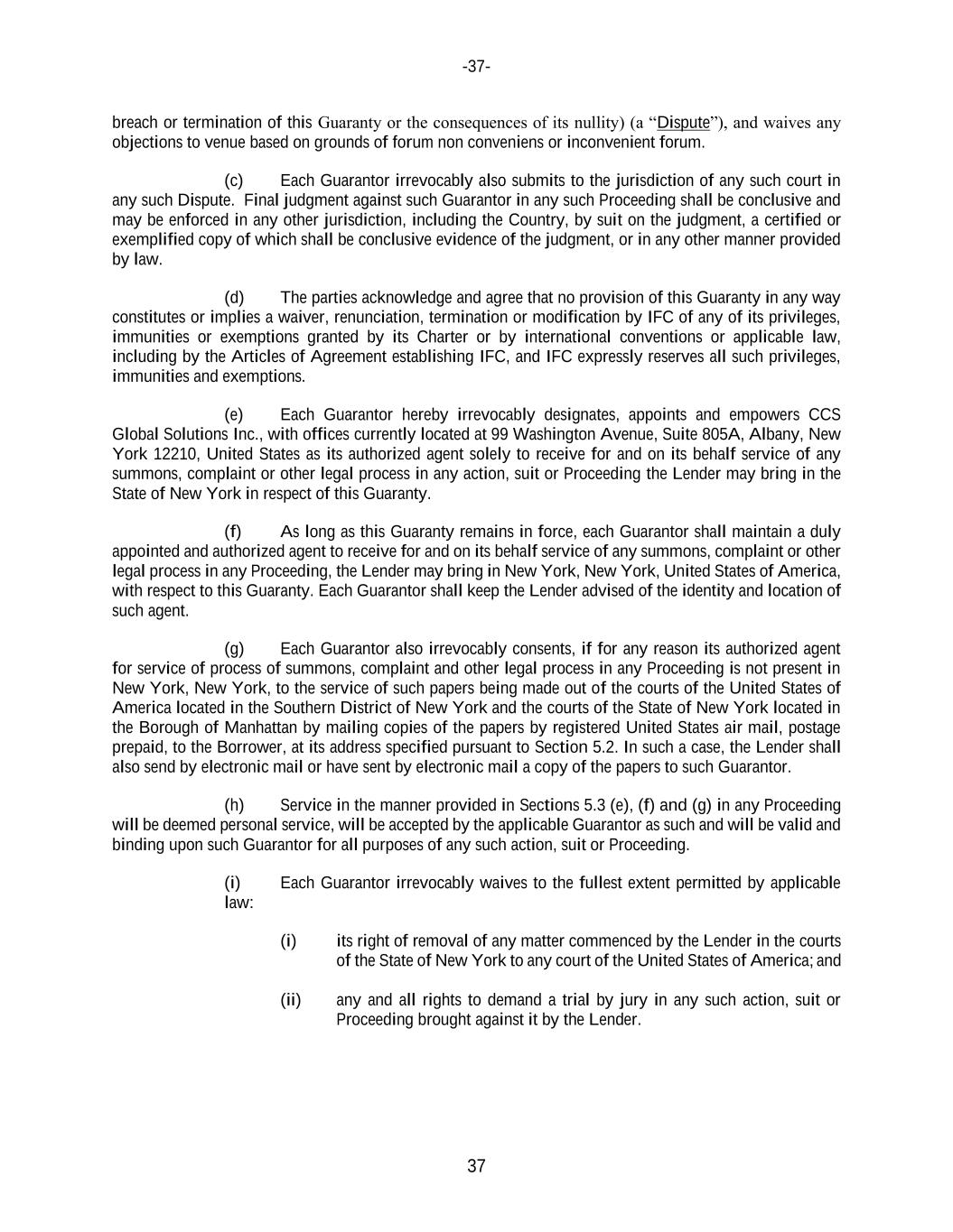 -37- 37 breach or termination of this Guaranty or the consequences of its nullity) (a “Dispute”), and waives any objections to venue based on grounds of forum non conveniens or inconvenient forum. (c) Each Guarantor irrevocably also submits to the jurisdiction of any such court in any such Dispute. Final judgment against such Guarantor in any such Proceeding shall be conclusive and may be enforced in any other jurisdiction, including the Country, by suit on the judgment, a certified or exemplified copy of which shall be conclusive evidence of the judgment, or in any other manner provided by law. (d) The parties acknowledge and agree that no provision of this Guaranty in any way constitutes or implies a waiver, renunciation, termination or modification by IFC of any of its privileges, immunities or exemptions granted by its Charter or by international conventions or applicable law, including by the Articles of Agreement establishing IFC, and IFC expressly reserves all such privileges, immunities and exemptions. (e) Each Guarantor hereby irrevocably designates, appoints and empowers CCS Global Solutions Inc., with offices currently located at 99 Washington Avenue, Suite 805A, Albany, New York 12210, United States as its authorized agent solely to receive for and on its behalf service of any summons, complaint or other legal process in any action, suit or Proceeding the Lender may bring in the State of New York in respect of this Guaranty. (f) As long as this Guaranty remains in force, each Guarantor shall maintain a duly appointed and authorized agent to receive for and on its behalf service of any summons, complaint or other legal process in any Proceeding, the Lender may bring in New York, New York, United States of America, with respect to this Guaranty. Each Guarantor shall keep the Lender advised of the identity and location of such agent. (g) Each Guarantor also irrevocably consents, if for any reason its authorized agent for service of process of summons, complaint and other legal process in any Proceeding is not present in New York, New York, to the service of such papers being made out of the courts of the United States of America located in the Southern District of New York and the courts of the State of New York located in the Borough of Manhattan by mailing copies of the papers by registered United States air mail, postage prepaid, to the Borrower, at its address specified pursuant to Section 5.2. In such a case, the Lender shall also send by electronic mail or have sent by electronic mail a copy of the papers to such Guarantor. (h) Service in the manner provided in Sections 5.3 (e), (f) and (g) in any Proceeding will be deemed personal service, will be accepted by the applicable Guarantor as such and will be valid and binding upon such Guarantor for all purposes of any such action, suit or Proceeding. (i) Each Guarantor irrevocably waives to the fullest extent permitted by applicable law: (i) its right of removal of any matter commenced by the Lender in the courts of the State of New York to any court of the United States of America; and (ii) any and all rights to demand a trial by jury in any such action, suit or Proceeding brought against it by the Lender.