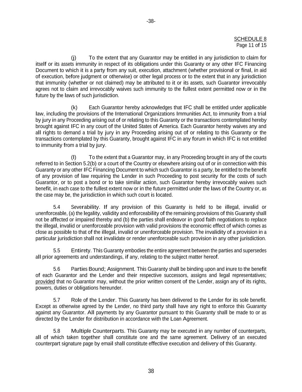 -38- 38 SCHEDULE 8 Page 11 of 15 (j) To the extent that any Guarantor may be entitled in any jurisdiction to claim for itself or its assets immunity in respect of its obligations under this Guaranty or any other IFC Financing Document to which it is a party from any suit, execution, attachment (whether provisional or final, in aid of execution, before judgment or otherwise) or other legal process or to the extent that in any jurisdiction that immunity (whether or not claimed) may be attributed to it or its assets, such Guarantor irrevocably agrees not to claim and irrevocably waives such immunity to the fullest extent permitted now or in the future by the laws of such jurisdiction. (k) Each Guarantor hereby acknowledges that IFC shall be entitled under applicable law, including the provisions of the International Organizations Immunities Act, to immunity from a trial by jury in any Proceeding arising out of or relating to this Guaranty or the transactions contemplated hereby brought against IFC in any court of the United States of America. Each Guarantor hereby waives any and all rights to demand a trial by jury in any Proceeding arising out of or relating to this Guaranty or the transactions contemplated by this Guaranty, brought against IFC in any forum in which IFC is not entitled to immunity from a trial by jury. (l) To the extent that a Guarantor may, in any Proceeding brought in any of the courts referred to in Section 5.2(b) or a court of the Country or elsewhere arising out of or in connection with this Guaranty or any other IFC Financing Document to which such Guarantor is a party, be entitled to the benefit of any provision of law requiring the Lender in such Proceeding to post security for the costs of such Guarantor, or to post a bond or to take similar action, such Guarantor hereby irrevocably waives such benefit, in each case to the fullest extent now or in the future permitted under the laws of the Country or, as the case may be, the jurisdiction in which such court is located. 5.4 Severability. If any provision of this Guaranty is held to be illegal, invalid or unenforceable, (a) the legality, validity and enforceability of the remaining provisions of this Guaranty shall not be affected or impaired thereby and (b) the parties shall endeavor in good faith negotiations to replace the illegal, invalid or unenforceable provision with valid provisions the economic effect of which comes as close as possible to that of the illegal, invalid or unenforceable provision. The invalidity of a provision in a particular jurisdiction shall not invalidate or render unenforceable such provision in any other jurisdiction. 5.5 Entirety. This Guaranty embodies the entire agreement between the parties and supersedes all prior agreements and understandings, if any, relating to the subject matter hereof. 5.6 Parties Bound; Assignment. This Guaranty shall be binding upon and inure to the benefit of each Guarantor and the Lender and their respective successors, assigns and legal representatives; provided that no Guarantor may, without the prior written consent of the Lender, assign any of its rights, powers, duties or obligations hereunder. 5.7 Role of the Lender. This Guaranty has been delivered to the Lender for its sole benefit. Except as otherwise agreed by the Lender, no third party shall have any right to enforce this Guaranty against any Guarantor. All payments by any Guarantor pursuant to this Guaranty shall be made to or as directed by the Lender for distribution in accordance with the Loan Agreement. 5.8 Multiple Counterparts. This Guaranty may be executed in any number of counterparts, all of which taken together shall constitute one and the same agreement. Delivery of an executed counterpart signature page by email shall constitute effective execution and delivery of this Guaranty.