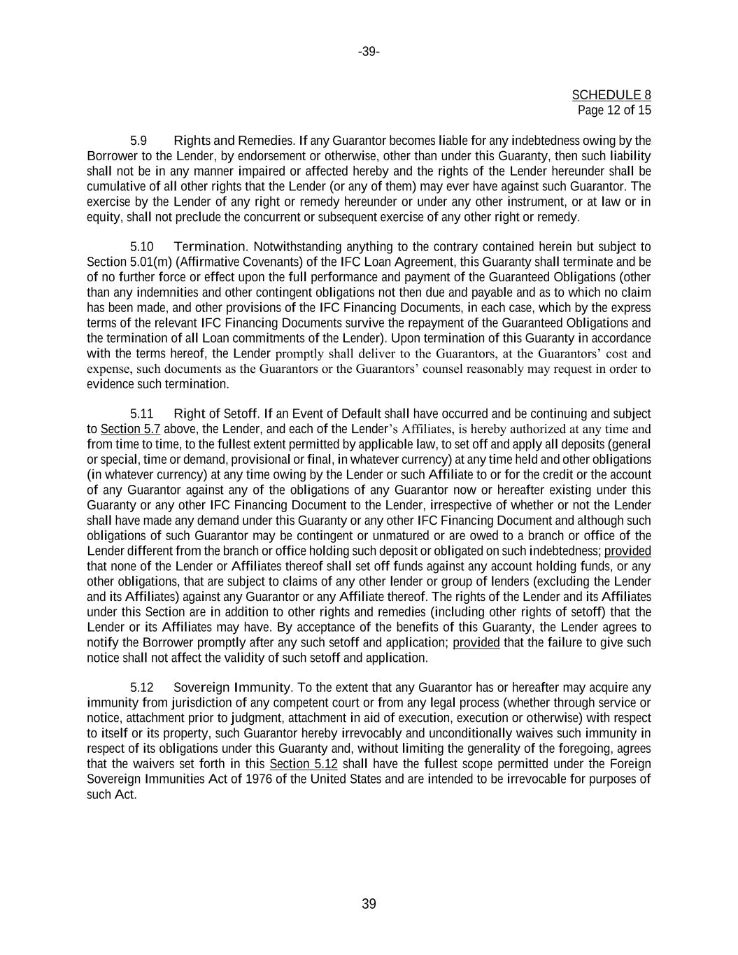 -39- 39 SCHEDULE 8 Page 12 of 15 5.9 Rights and Remedies. If any Guarantor becomes liable for any indebtedness owing by the Borrower to the Lender, by endorsement or otherwise, other than under this Guaranty, then such liability shall not be in any manner impaired or affected hereby and the rights of the Lender hereunder shall be cumulative of all other rights that the Lender (or any of them) may ever have against such Guarantor. The exercise by the Lender of any right or remedy hereunder or under any other instrument, or at law or in equity, shall not preclude the concurrent or subsequent exercise of any other right or remedy. 5.10 Termination. Notwithstanding anything to the contrary contained herein but subject to Section 5.01(m) (Affirmative Covenants) of the IFC Loan Agreement, this Guaranty shall terminate and be of no further force or effect upon the full performance and payment of the Guaranteed Obligations (other than any indemnities and other contingent obligations not then due and payable and as to which no claim has been made, and other provisions of the IFC Financing Documents, in each case, which by the express terms of the relevant IFC Financing Documents survive the repayment of the Guaranteed Obligations and the termination of all Loan commitments of the Lender). Upon termination of this Guaranty in accordance with the terms hereof, the Lender promptly shall deliver to the Guarantors, at the Guarantors’ cost and expense, such documents as the Guarantors or the Guarantors’ counsel reasonably may request in order to evidence such termination. 5.11 Right of Setoff. If an Event of Default shall have occurred and be continuing and subject to Section 5.7 above, the Lender, and each of the Lender’s Affiliates, is hereby authorized at any time and from time to time, to the fullest extent permitted by applicable law, to set off and apply all deposits (general or special, time or demand, provisional or final, in whatever currency) at any time held and other obligations (in whatever currency) at any time owing by the Lender or such Affiliate to or for the credit or the account of any Guarantor against any of the obligations of any Guarantor now or hereafter existing under this Guaranty or any other IFC Financing Document to the Lender, irrespective of whether or not the Lender shall have made any demand under this Guaranty or any other IFC Financing Document and although such obligations of such Guarantor may be contingent or unmatured or are owed to a branch or office of the Lender different from the branch or office holding such deposit or obligated on such indebtedness; provided that none of the Lender or Affiliates thereof shall set off funds against any account holding funds, or any other obligations, that are subject to claims of any other lender or group of lenders (excluding the Lender and its Affiliates) against any Guarantor or any Affiliate thereof. The rights of the Lender and its Affiliates under this Section are in addition to other rights and remedies (including other rights of setoff) that the Lender or its Affiliates may have. By acceptance of the benefits of this Guaranty, the Lender agrees to notify the Borrower promptly after any such setoff and application; provided that the failure to give such notice shall not affect the validity of such setoff and application. 5.12 Sovereign Immunity. To the extent that any Guarantor has or hereafter may acquire any immunity from jurisdiction of any competent court or from any legal process (whether through service or notice, attachment prior to judgment, attachment in aid of execution, execution or otherwise) with respect to itself or its property, such Guarantor hereby irrevocably and unconditionally waives such immunity in respect of its obligations under this Guaranty and, without limiting the generality of the foregoing, agrees that the waivers set forth in this Section 5.12 shall have the fullest scope permitted under the Foreign Sovereign Immunities Act of 1976 of the United States and are intended to be irrevocable for purposes of such Act.