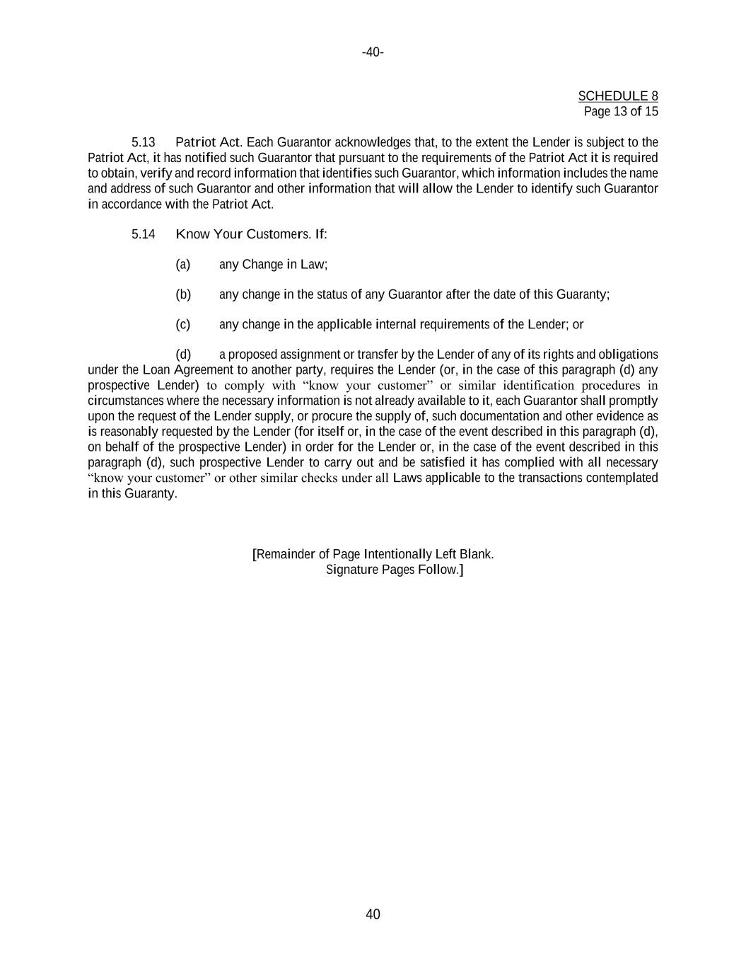 -40- 40 SCHEDULE 8 Page 13 of 15 5.13 Patriot Act. Each Guarantor acknowledges that, to the extent the Lender is subject to the Patriot Act, it has notified such Guarantor that pursuant to the requirements of the Patriot Act it is required to obtain, verify and record information that identifies such Guarantor, which information includes the name and address of such Guarantor and other information that will allow the Lender to identify such Guarantor in accordance with the Patriot Act. 5.14 Know Your Customers. If: (a) any Change in Law; (b) any change in the status of any Guarantor after the date of this Guaranty; (c) any change in the applicable internal requirements of the Lender; or (d) a proposed assignment or transfer by the Lender of any of its rights and obligations under the Loan Agreement to another party, requires the Lender (or, in the case of this paragraph (d) any prospective Lender) to comply with “know your customer” or similar identification procedures in circumstances where the necessary information is not already available to it, each Guarantor shall promptly upon the request of the Lender supply, or procure the supply of, such documentation and other evidence as is reasonably requested by the Lender (for itself or, in the case of the event described in this paragraph (d), on behalf of the prospective Lender) in order for the Lender or, in the case of the event described in this paragraph (d), such prospective Lender to carry out and be satisfied it has complied with all necessary “know your customer” or other similar checks under all Laws applicable to the transactions contemplated in this Guaranty. [Remainder of Page Intentionally Left Blank. Signature Pages Follow.]