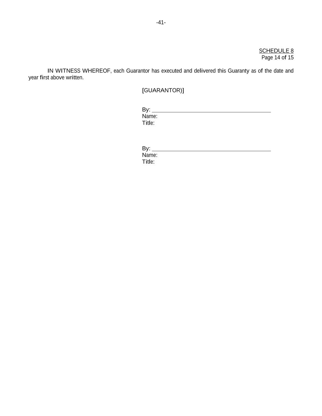 -41- SCHEDULE 8 Page 14 of 15 IN WITNESS WHEREOF, each Guarantor has executed and delivered this Guaranty as of the date and year first above written. [GUARANTOR)] By: Name: Title: By: Name: Title: