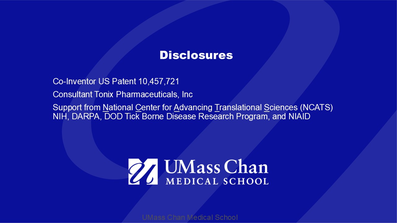UMass Chan Medical School Disclosures Co - Inventor US Patent 10,457,721 Consultant Tonix Pharmaceuticals, Inc Support from N ational C enter for A dvancing T ranslational S ciences (NCATS) NIH, DARPA, DOD Tick Borne Disease Research Program, and NIAID
