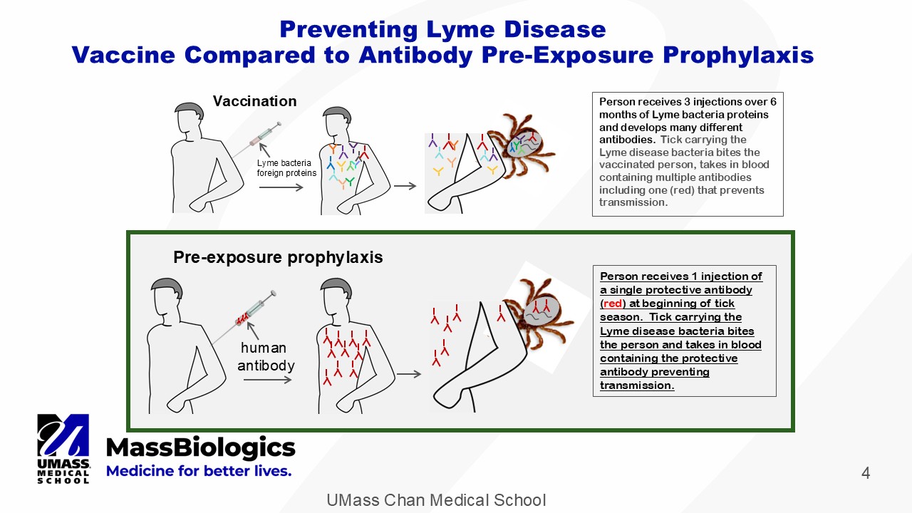 UMass Chan Medical School 4 Pre - exposure prophylaxis human antibody Person receives 1 injection of a single protective antibody ( red ) at beginning of tick season. Tick carrying the Lyme disease bacteria bites the person and takes in blood containing the protective antibody preventing transmission. Vaccination Person receives 3 injections over 6 months of Lyme bacteria proteins and develops many different antibodies. Tick carrying the Lyme disease bacteria bites the vaccinated person, takes in blood containing multiple antibodies including one (red) that prevents transmission. Lyme bacteria foreign proteins Preventing Lyme Disease Vaccine Compared to Antibody Pre - Exposure Prophylaxis