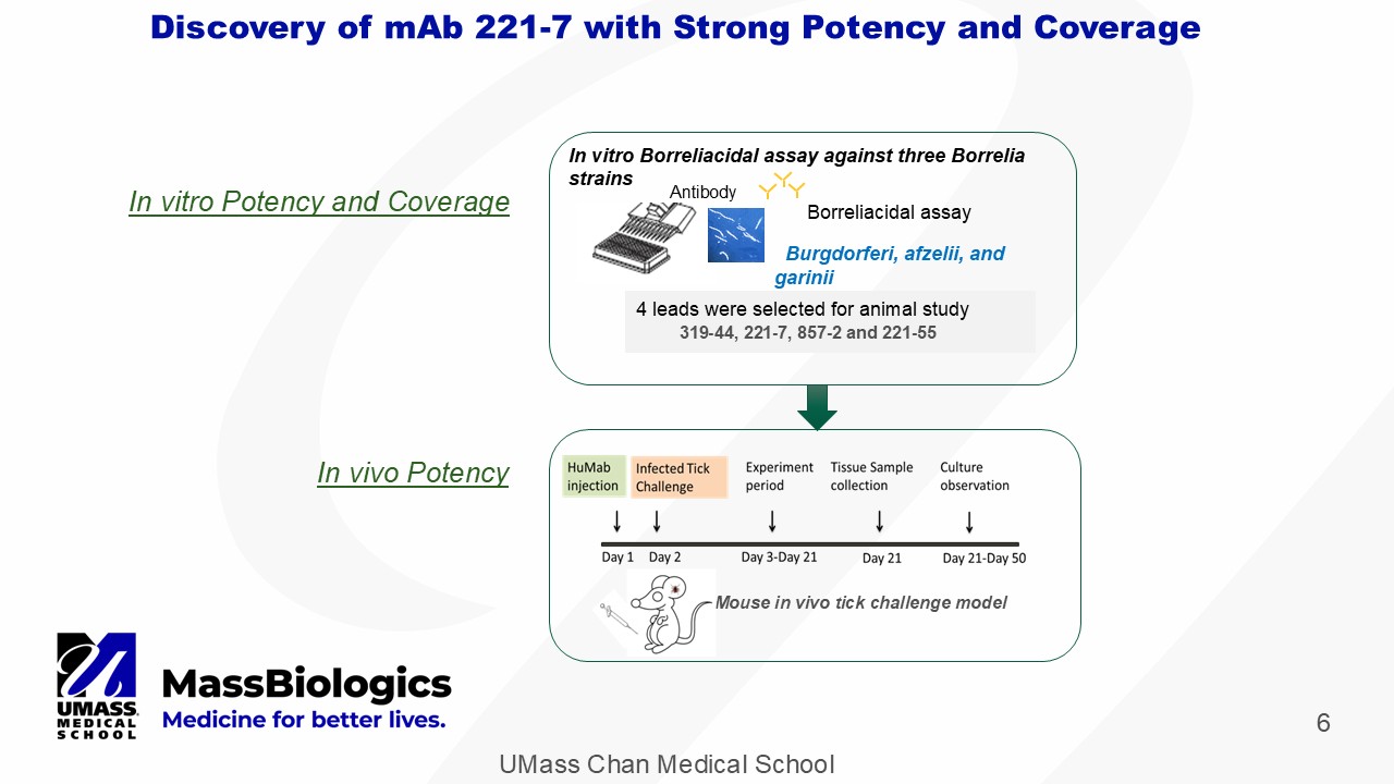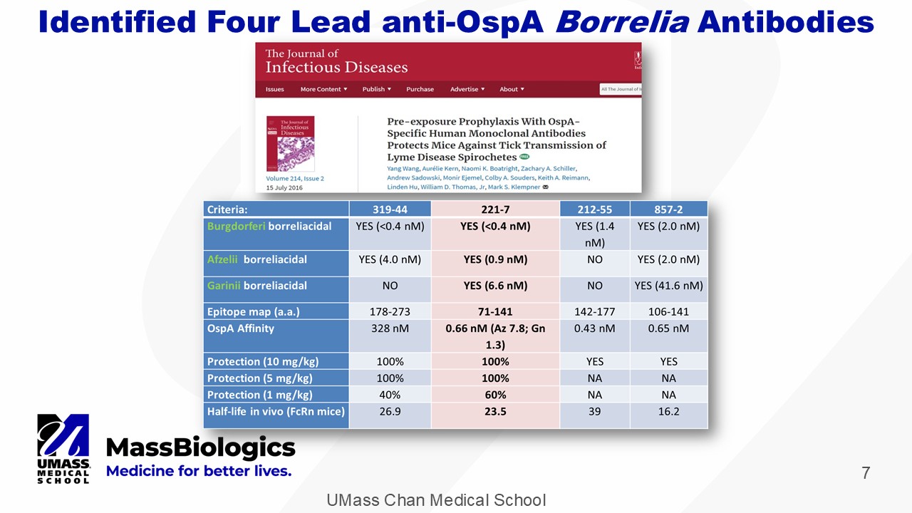 UMass Chan Medical School 5 Discovery of mAB 221 - 7 with Potent Bactericidal Activity and Coverage of Three OspA Serotypes • Essential for survival while in tick midgut • Anti - OspA immunity is effective in both animals and humans The Target Approach Outer surface protein A ( OspA ) of the Spirochete