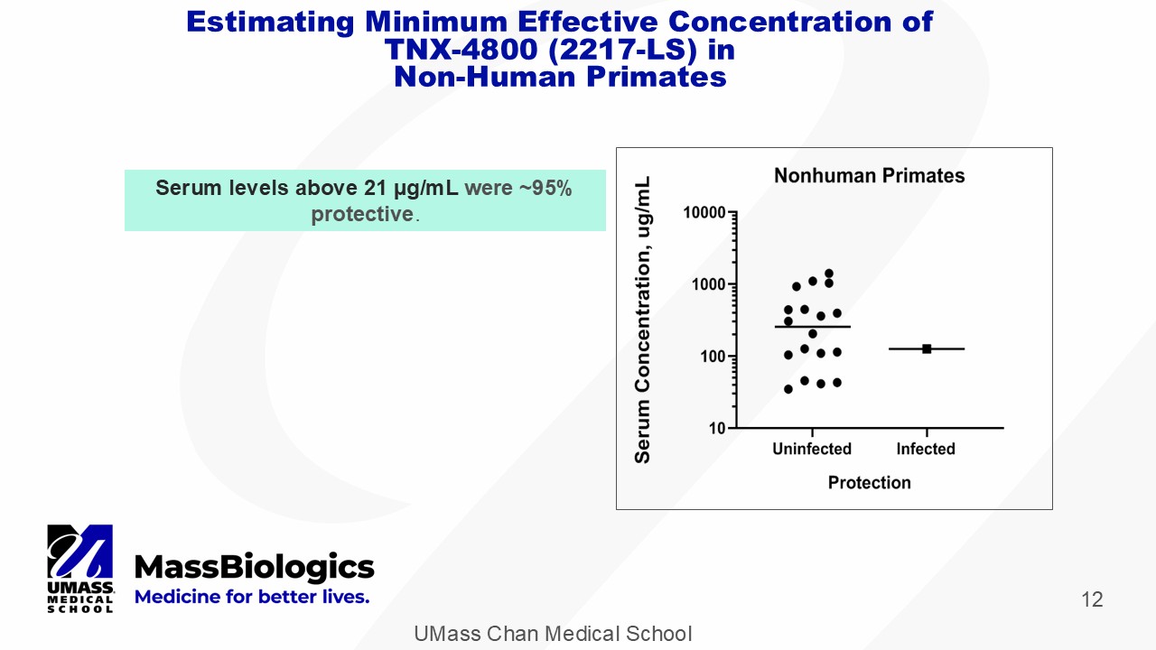 UMass Chan Medical School 12 Serum levels above 21 µg/mL were ~95% protective . Estimating Minimum Effective Concentration of TNX - 4800 (2217 - LS) in Non - Human Primates
