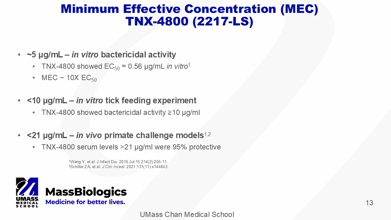 UMass Chan Medical School 13 Minimum Effective Concentration (MEC) TNX - 4800 (2217 - LS) • ~ 5 μ g/mL – in vitro bactericidal activity • TNX - 4800 showed EC 50 ≈ 0.56 μ g/mL in vitro 1 • MEC ~ 10X EC 50 • <10 μ g/mL – in vitro tick feeding experiment • TNX - 4800 showed bactericidal activity ≥10 μ g/ml • <21 μ g/mL – in vivo primate challenge models 1,2 • TNX - 4800 serum levels >21 μ g/ml were 95% protective 1 Wang Y, et al. J Infect Dis. 2016 Jul 15;214(2):205 - 11. 2 Schiller ZA, et al. J Clin Invest . 2021;131(11):e144843.