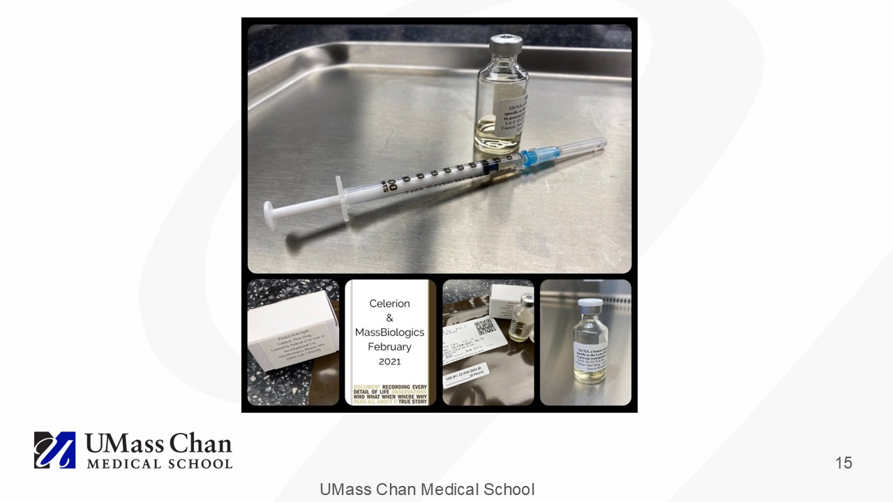 UMass Chan Medical School 14 Nonclinical Safety Data TNX - 4800 ▪ cGLP Tissue Cross Reactivity study in rat and human tissues • No significant cross - reactivity ▪ Non - GLP pharmacokinetic and tick challenge studies in monkeys • Did not reveal a safety signal ▪ cGLP 5 week multiple dose study with 4 week recovery in rats and a cGLP single dose local tolerance study in rats • Observed abnormalities were mild to moderate and all findings were judged non aversive (hematologic and ALT, AST ALP and APTT increases (notably without bilirubin changes), injection site inflammation, liver and spleen organ weight increases, liver histopathology, primarily in males. All findings were reversible). ▪ Exposure in Phase 1 was multiples relative to NOAEL in rats • Starting dose: 63 to 242 – fold lower • Highest dose: 3 to 12 – fold lower NOAEL = No - observed - adverse - effect level