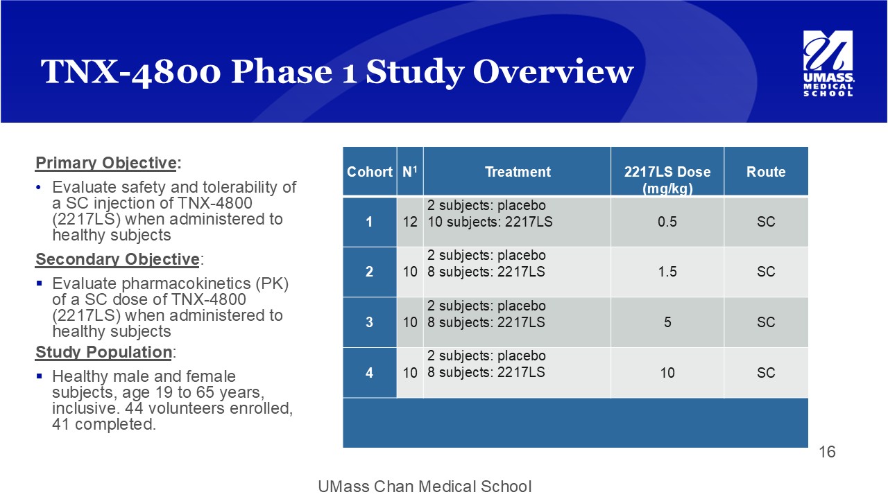 UMass Chan Medical School Primary Objective : • Evaluate safety and tolerability of a SC injection of TNX - 4800 (2217LS) when administered to healthy subjects Secondary Objective : ▪ Evaluate pharmacokinetics (PK) of a SC dose of TNX - 4800 (2217LS) when administered to healthy subjects Study Population : ▪ Healthy male and female subjects, age 19 to 65 years, inclusive. 44 volunteers enrolled, 41 completed. TNX - 4800 Phase 1 Study Overview Route 2217LS Dose (mg/kg) Treatment N 1 Cohort SC 0.5 2 subjects: placebo 10 subjects: 2217LS 12 1 SC 1.5 2 subjects: placebo 8 subjects: 2217LS 10 2 SC 5 2 subjects: placebo 8 subjects: 2217LS 10 3 SC 10 2 subjects: placebo 8 subjects: 2217LS 10 4 16