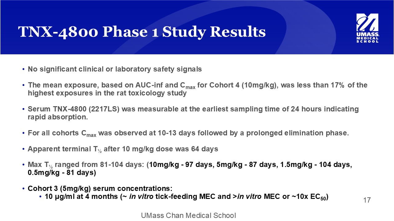 UMass Chan Medical School • No significant clinical or laboratory safety signals • The mean exposure, based on AUC - inf and C max for Cohort 4 (10mg/kg), was less than 17% of the highest exposures in the rat toxicology study • Serum TNX - 4800 (2217LS) was measurable at the earliest sampling time of 24 hours indicating rapid absorption. • For all cohorts C max was observed at 10 - 13 days followed by a prolonged elimination phase. • Apparent terminal T ½ after 10 mg/kg dose was 64 days • Max T ½ ranged from 81 - 104 days: ( 10mg/kg - 97 days, 5mg/kg - 87 days, 1.5mg/kg - 104 days, 0.5mg/kg - 81 days) • Cohort 3 (5mg/kg) serum concentrations: • 10 μ g/ml at 4 months (~ in vitro tick - feeding MEC and > in vitro MEC or ~10x EC 50 ) TNX - 4800 Phase 1 Study Results 17