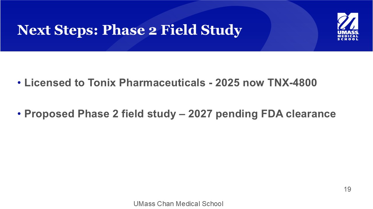 UMass Chan Medical School • Licensed to Tonix Pharmaceuticals - 2025 now TNX - 4800 • Proposed Phase 2 field study – 2027 pending FDA clearance Next Steps: Phase 2 Field Study 19