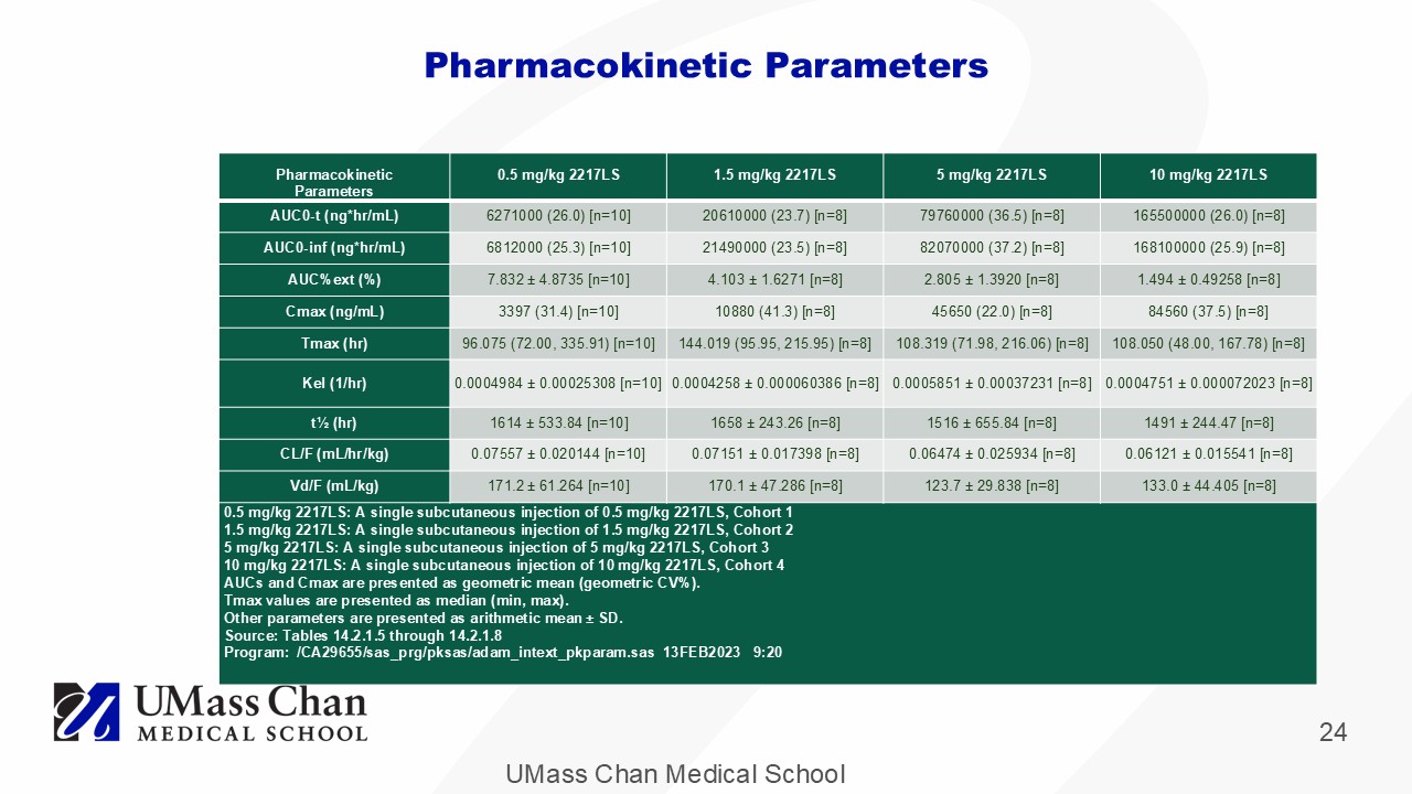 UMass Chan Medical School 24 Pharmacokinetic Parameters 10 mg/kg 2217LS 5 mg/kg 2217LS 1.5 mg/kg 2217LS 0.5 mg/kg 2217LS Pharmacokinetic Parameters 165500000 (26.0) [n=8] 79760000 (36.5) [n=8] 20610000 (23.7) [n=8] 6271000 (26.0) [n=10] AUC0 - t (ng* hr /mL) 168100000 (25.9) [n=8] 82070000 (37.2) [n=8] 21490000 (23.5) [n=8] 6812000 (25.3) [n=10] AUC0 - inf (ng* hr /mL) 1.494 ± 0.49258 [n=8] 2.805 ± 1.3920 [n=8] 4.103 ± 1.6271 [n=8] 7.832 ± 4.8735 [n=10] AUC%ext (%) 84560 (37.5) [n=8] 45650 (22.0) [n=8] 10880 (41.3) [n=8] 3397 (31.4) [n=10] Cmax (ng/mL) 108.050 (48.00, 167.78) [n=8] 108.319 (71.98, 216.06) [n=8] 144.019 (95.95, 215.95) [n=8] 96.075 (72.00, 335.91) [n=10] Tmax ( hr ) 0.0004751 ± 0.000072023 [n=8] 0.0005851 ± 0.00037231 [n=8] 0.0004258 ± 0.000060386 [n=8] 0.0004984 ± 0.00025308 [n=10] Kel (1/hr) 1491 ± 244.47 [n=8] 1516 ± 655.84 [n=8] 1658 ± 243.26 [n=8] 1614 ± 533.84 [n=10] t½ ( hr ) 0.06121 ± 0.015541 [n=8] 0.06474 ± 0.025934 [n=8] 0.07151 ± 0.017398 [n=8] 0.07557 ± 0.020144 [n=10] CL/F (mL/ hr /kg) 133.0 ± 44.405 [n=8] 123.7 ± 29.838 [n=8] 170.1 ± 47.286 [n=8] 171.2 ± 61.264 [n=10] Vd /F (mL/kg) 0.5 mg/kg 2217LS: A single subcutaneous injection of 0.5 mg/kg 2217LS, Cohort 1 1.5 mg/kg 2217LS: A single subcutaneous injection of 1.5 mg/kg 2217LS, Cohort 2 5 mg/kg 2217LS: A single subcutaneous injection of 5 mg/kg 2217LS, Cohort 3 10 mg/kg 2217LS: A single subcutaneous injection of 10 mg/kg 2217LS, Cohort 4 AUCs and Cmax are presented as geometric mean (geometric CV%). Tmax values are presented as median (min, max). Other parameters are presented as arithmetic mean ± SD. Source: Tables 14.2.1.5 through 14.2.1.8 Program: /CA29655/ sas_prg / pksas / adam_intext_pkparam.sas 13FEB2023 9:20