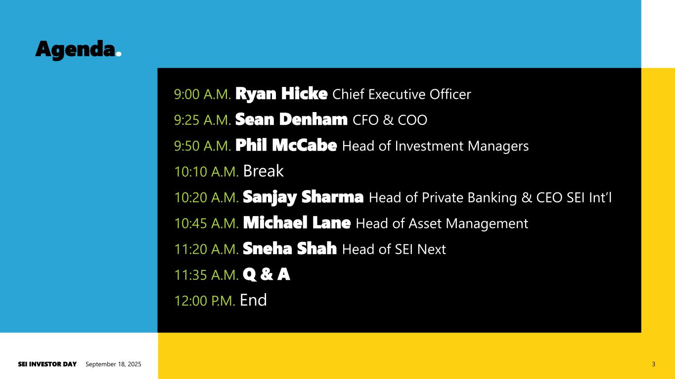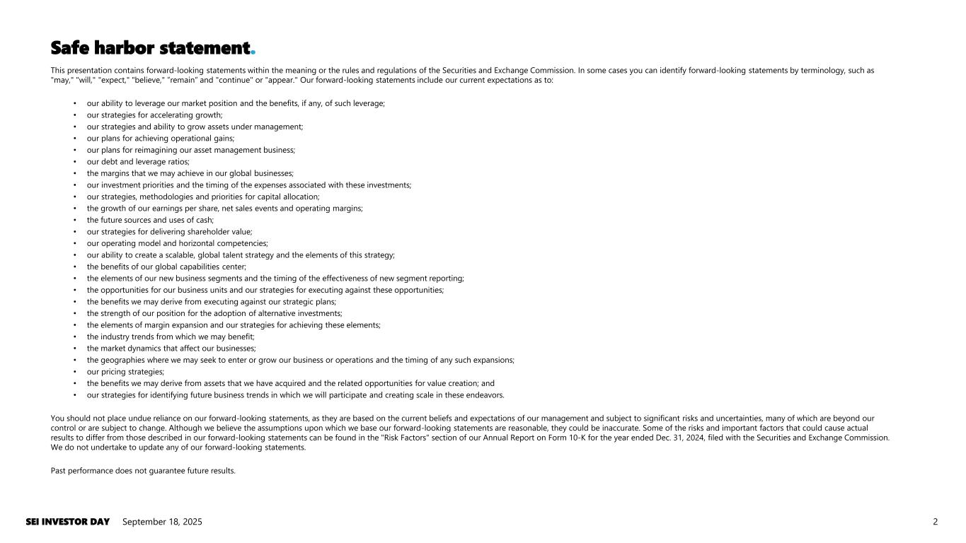 Safe harbor statement. September 18, 2025SEI INVESTOR DAY 2 This presentation contains forward-looking statements within the meaning or the rules and regulations of the Securities and Exchange Commission. In some cases you can identify forward-looking statements by terminology, such as "may," "will," "expect," "believe," ”remain” and "continue" or "appear." Our forward-looking statements include our current expectations as to: • our ability to leverage our market position and the benefits, if any, of such leverage; • our strategies for accelerating growth; • our strategies and ability to grow assets under management; • our plans for achieving operational gains; • our plans for reimagining our asset management business; • our debt and leverage ratios; • the margins that we may achieve in our global businesses; • our investment priorities and the timing of the expenses associated with these investments; • our strategies, methodologies and priorities for capital allocation; • the growth of our earnings per share, net sales events and operating margins; • the future sources and uses of cash; • our strategies for delivering shareholder value; • our operating model and horizontal competencies; • our ability to create a scalable, global talent strategy and the elements of this strategy; • the benefits of our global capabilities center; • the elements of our new business segments and the timing of the effectiveness of new segment reporting; • the opportunities for our business units and our strategies for executing against these opportunities; • the benefits we may derive from executing against our strategic plans; • the strength of our position for the adoption of alternative investments; • the elements of margin expansion and our strategies for achieving these elements; • the industry trends from which we may benefit; • the market dynamics that affect our businesses; • the geographies where we may seek to enter or grow our business or operations and the timing of any such expansions; • our pricing strategies; • the benefits we may derive from assets that we have acquired and the related opportunities for value creation; and • our strategies for identifying future business trends in which we will participate and creating scale in these endeavors. You should not place undue reliance on our forward-looking statements, as they are based on the current beliefs and expectations of our management and subject to significant risks and uncertainties, many of which are beyond our control or are subject to change. Although we believe the assumptions upon which we base our forward-looking statements are reasonable, they could be inaccurate. Some of the risks and important factors that could cause actual results to differ from those described in our forward-looking statements can be found in the "Risk Factors" section of our Annual Report on Form 10-K for the year ended Dec. 31, 2024, filed with the Securities and Exchange Commission. We do not undertake to update any of our forward-looking statements. Past performance does not guarantee future results.