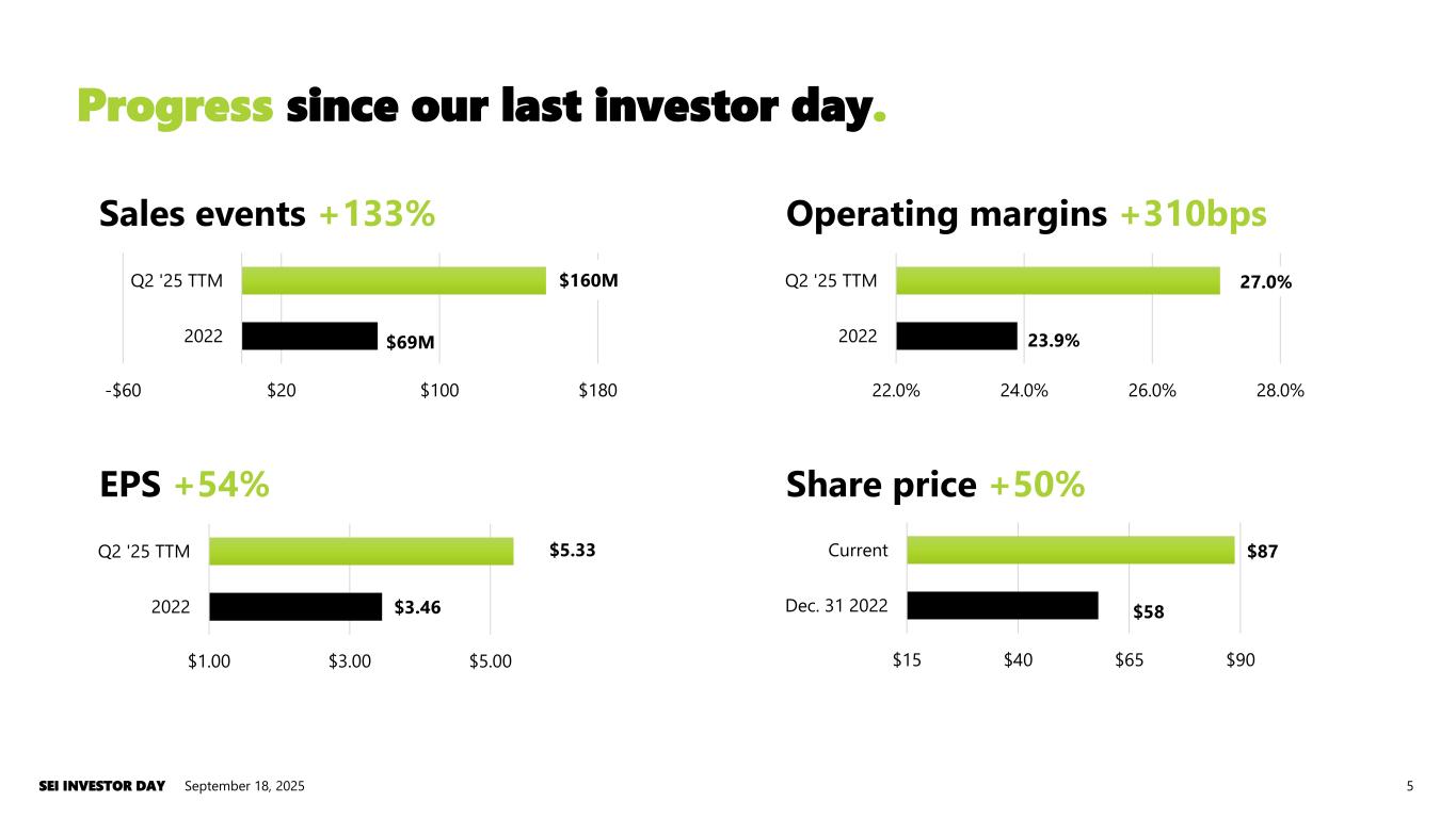 -$60 $20 $100 $180 2022 Q2 '25 TTM $69M $160M 22.0% 24.0% 26.0% 28.0% 2022 Q2 '25 TTM 23.9% 27.0% $1.00 $3.00 $5.00 2022 Q2 '25 TTM $3.46 $5.33 $15 $40 $65 $90 Dec. 31 2022 Current $58 $87 Sales events +133% Operating margins +310bps EPS +54% Share price +50% Progress since our last investor day. September 18, 2025SEI INVESTOR DAY 5