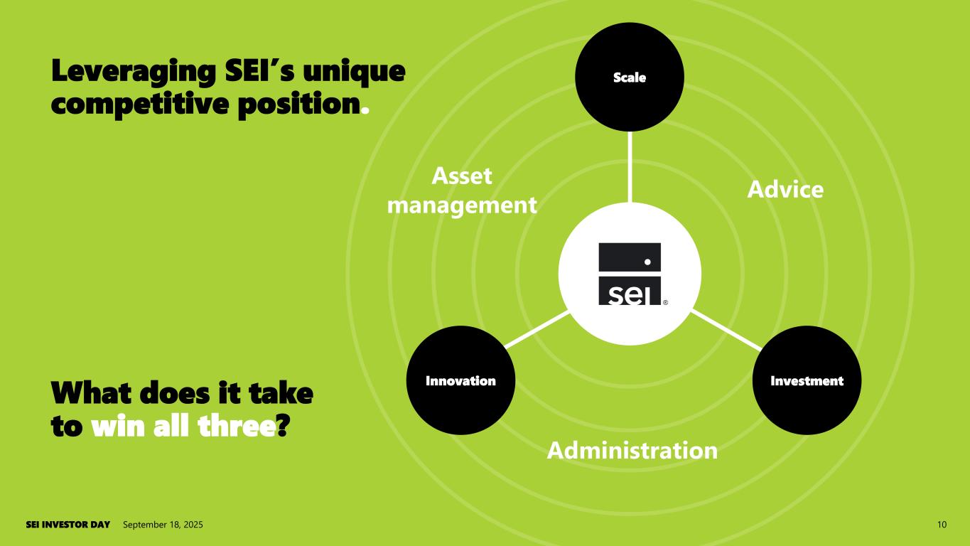 Ryan Hicke becomes CEO Sanjay Sharma leads Private Banking Sandy Ewing leads Family Office Services Sneha Shah joins SEI to lead SEI Next Sean Denham joins SEI as CFO – role later expands to COO Michael Lane joins SEI to lead Asset Management businesses Today September 18, 2025SEI INVESTOR DAY 9 Leadership. April 2022 April 2022 Today Putting top talent in most impactful roles. Amy Sliwinski joins SEI as Chief People and Culture Officer