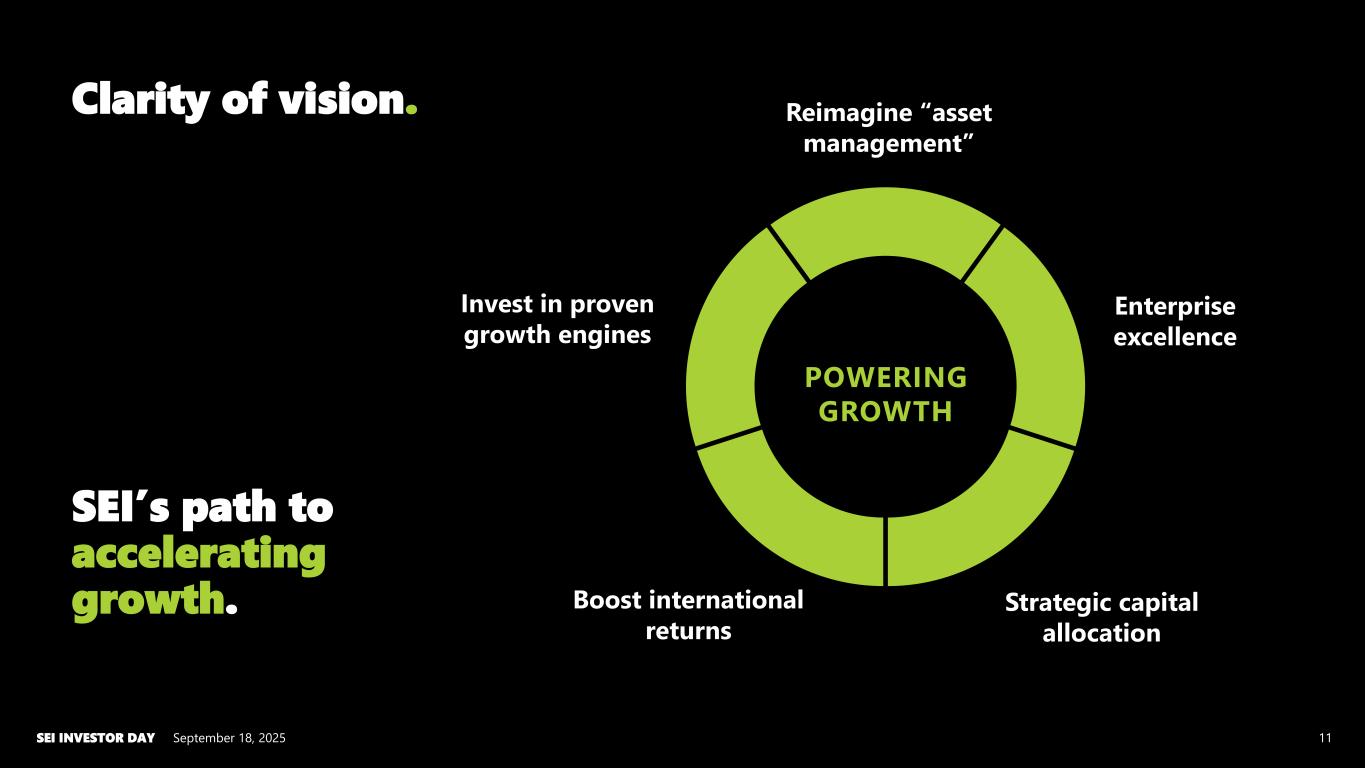 September 18, 2025SEI INVESTOR DAY 10 Leveraging SEI’s unique competitive position. Advice Administration Asset management What does it take to win all three? Innovation Scale Investment