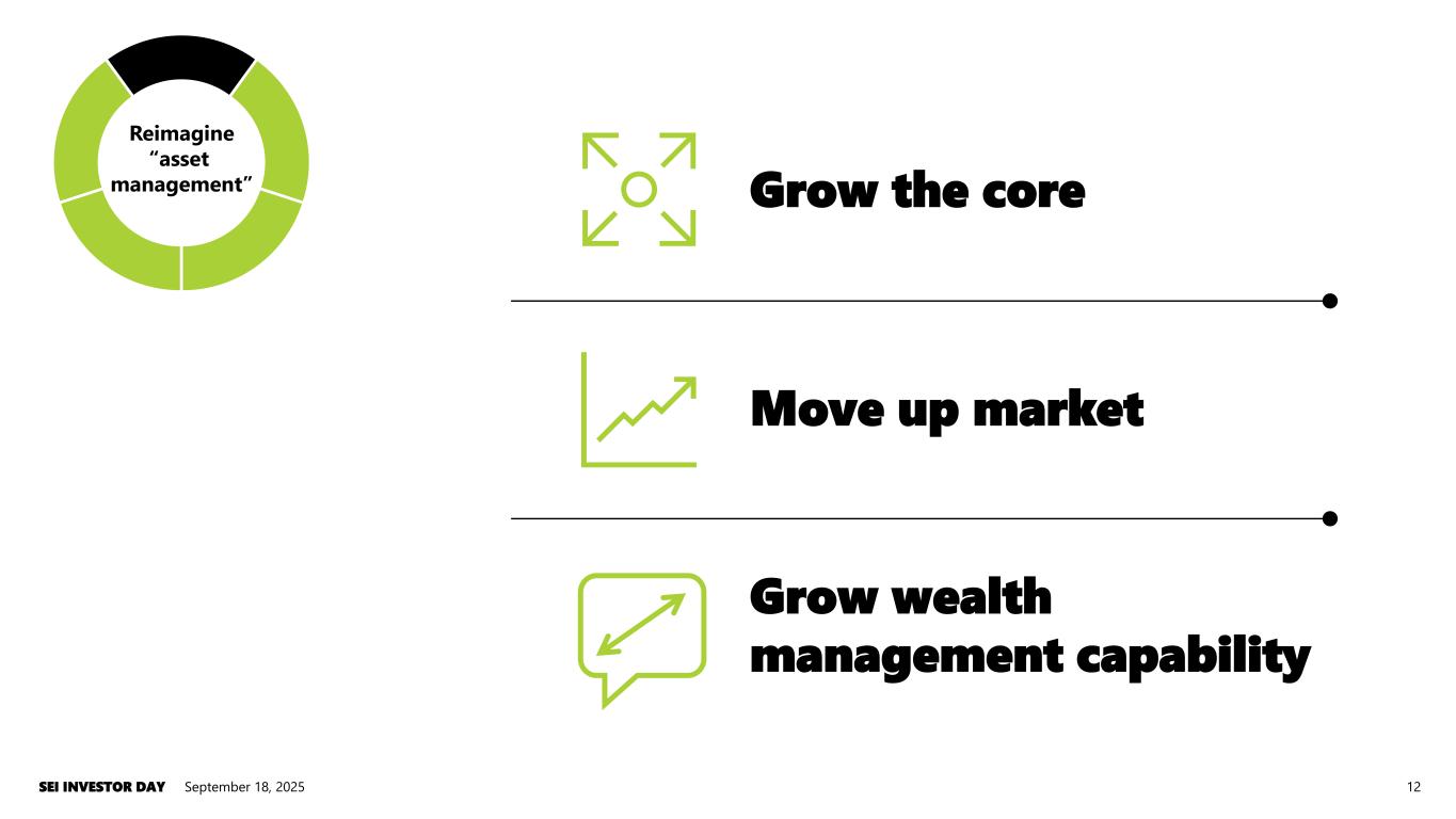 September 18, 2025SEI INVESTOR DAY 11 Clarity of vision. POWERING GROWTH Invest in proven growth engines Enterprise excellence Strategic capital allocation Boost international returns Reimagine “asset management” Reimagine “asset management” SEI’s path to accelerating growth.