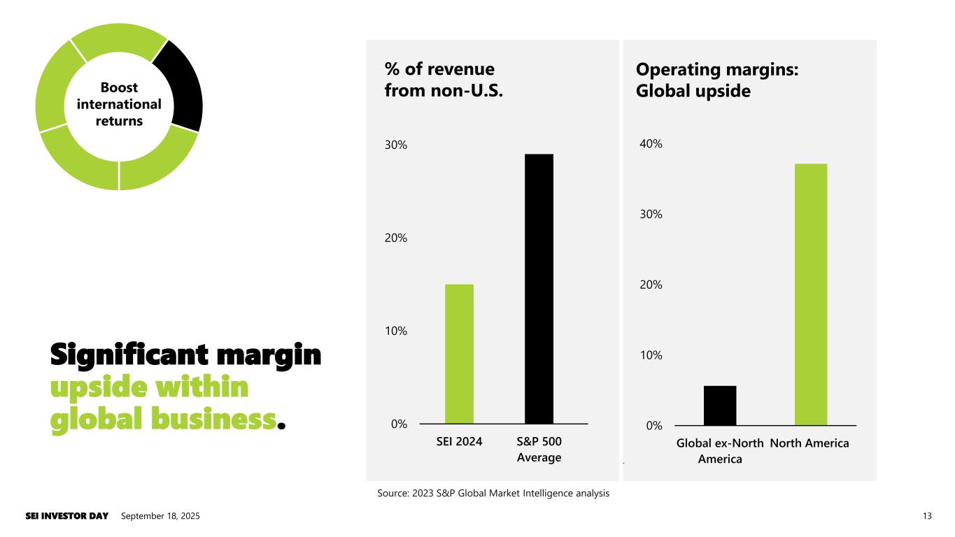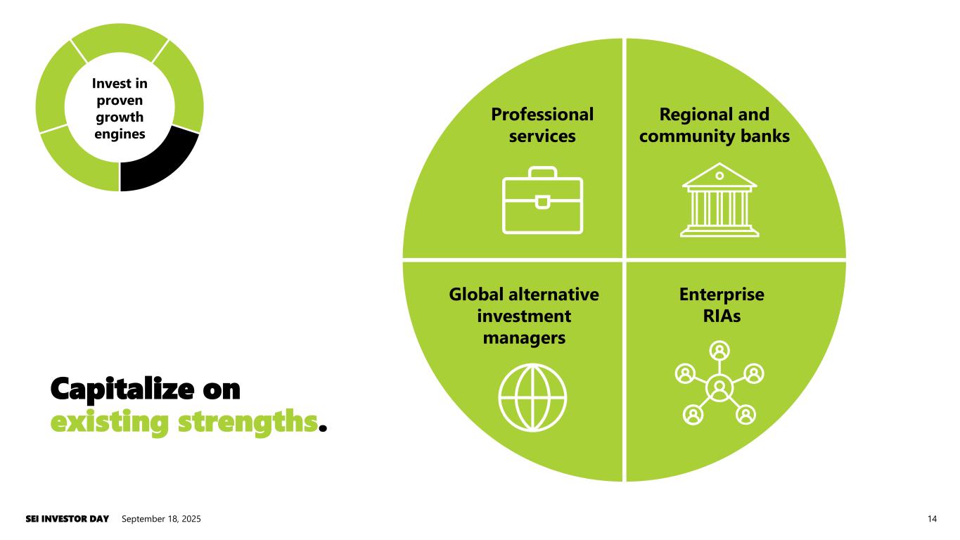 0% 10% 20% 30% SEI 2024 S&P 500 Average SEI 2030 Target September 18, 2025SEI INVESTOR DAY 13 Significant margin upside within global business. 0% 10% 20% 30% 40% Global ex-North America North America Operating margins: Global upside % of revenue from non-U.S. Boost international returns Boost international returns Source: 2023 S&P Global Market Intelligence analysis