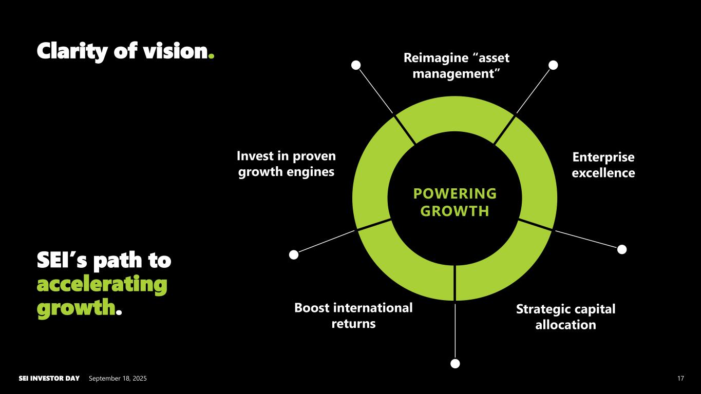 September 18, 2025SEI INVESTOR DAY 16 Smart use of capital against growth opportunities. Capital Allocation: More than money Balance sheet strategy Dividends and buybacks M&A and internal investment Human capital Automation and innovation Strategic capital allocation Strategic capital allocation