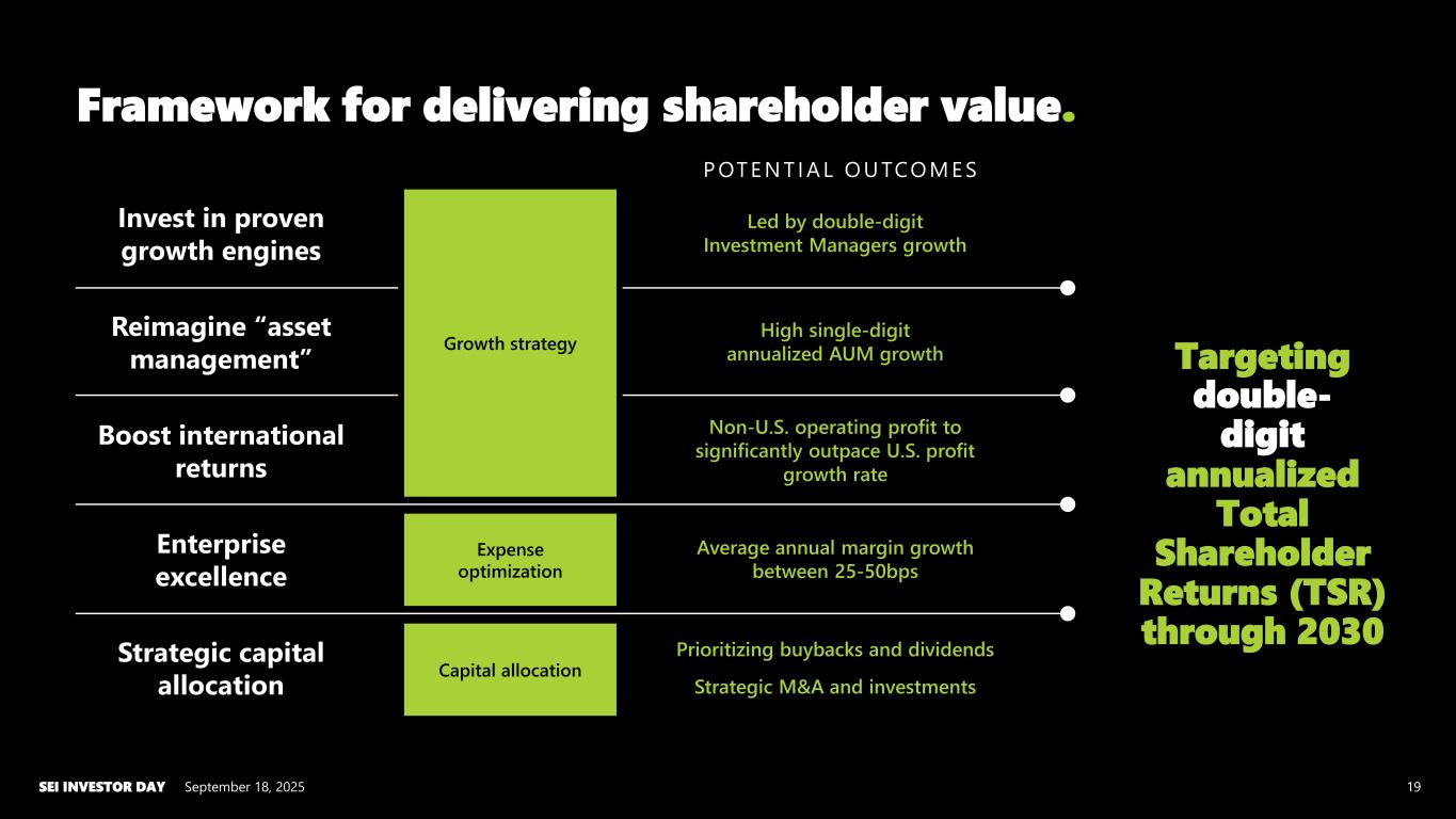 September 18, 2025SEI INVESTOR DAY 17 POWERING GROWTH Invest in proven growth engines Enterprise excellence Strategic capital allocation Boost international returns Reimagine “asset management” Reimagine “asset management” Clarity of vision. SEI’s path to accelerating growth.