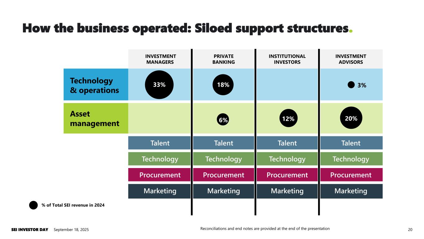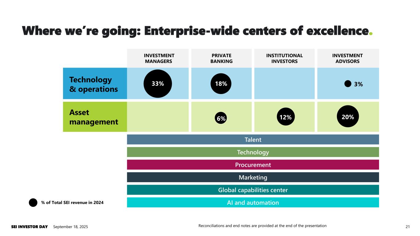 INVESTMENT MANAGERS PRIVATE BANKING INSTITUTIONAL INVESTORS INVESTMENT ADVISORS Technology & operations Asset management Talent Talent Talent Talent Technology Technology Technology Technology Procurement Procurement Procurement Procurement Marketing Marketing Marketing Marketing Reconciliations and end notes are provided at the end of the presentation 12% 20%6% 33% 18% 3% How the business operated: Siloed support structures. 20September 18, 2025SEI INVESTOR DAY % of Total SEI revenue in 2024