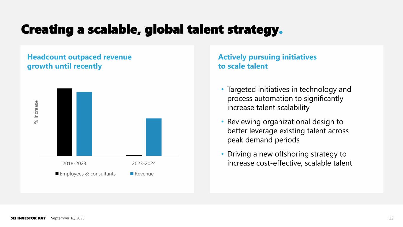 INVESTMENT MANAGERS PRIVATE BANKING INSTITUTIONAL INVESTORS INVESTMENT ADVISORS Technology & operations Asset management Talent Technology Procurement Marketing Global capabilities center AI and automation Reconciliations and end notes are provided at the end of the presentation 12% 20%6% 33% 18% 3% Where we’re going: Enterprise-wide centers of excellence. 21September 18, 2025SEI INVESTOR DAY % of Total SEI revenue in 2024