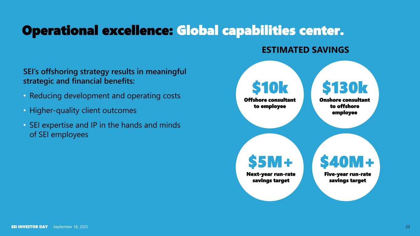 Creating a scalable, global talent strategy. September 18, 2025SEI INVESTOR DAY 22 Headcount outpaced revenue growth until recently • Targeted initiatives in technology and process automation to significantly increase talent scalability • Reviewing organizational design to better leverage existing talent across peak demand periods • Driving a new offshoring strategy to increase cost-effective, scalable talent Actively pursuing initiatives to scale talent 2018-2023 2023-2024 % i n cr e a se Employees & consultants Revenue