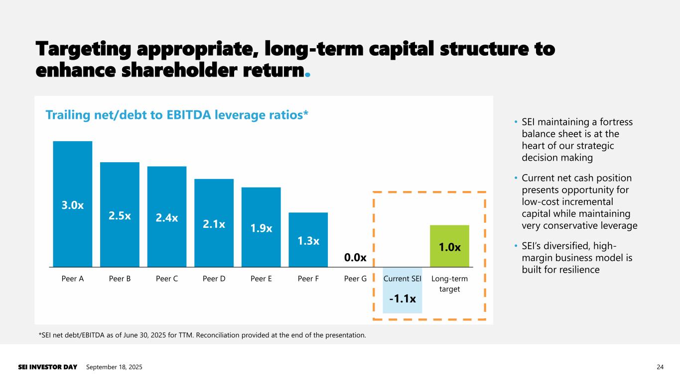 Targeting appropriate, long-term capital structure to enhance shareholder return. September 18, 2025SEI INVESTOR DAY 24 3.0x 2.5x 2.4x 2.1x 1.9x 1.3x 0.0x -1.1x 1.0x Peer A Peer B Peer C Peer D Peer E Peer F Peer G Current SEI Long-term target Trailing net/debt to EBITDA leverage ratios* • SEI maintaining a fortress balance sheet is at the heart of our strategic decision making • Current net cash position presents opportunity for low-cost incremental capital while maintaining very conservative leverage • SEI’s diversified, high- margin business model is built for resilience *SEI net debt/EBITDA as of June 30, 2025 for TTM. Reconciliation provided at the end of the presentation.