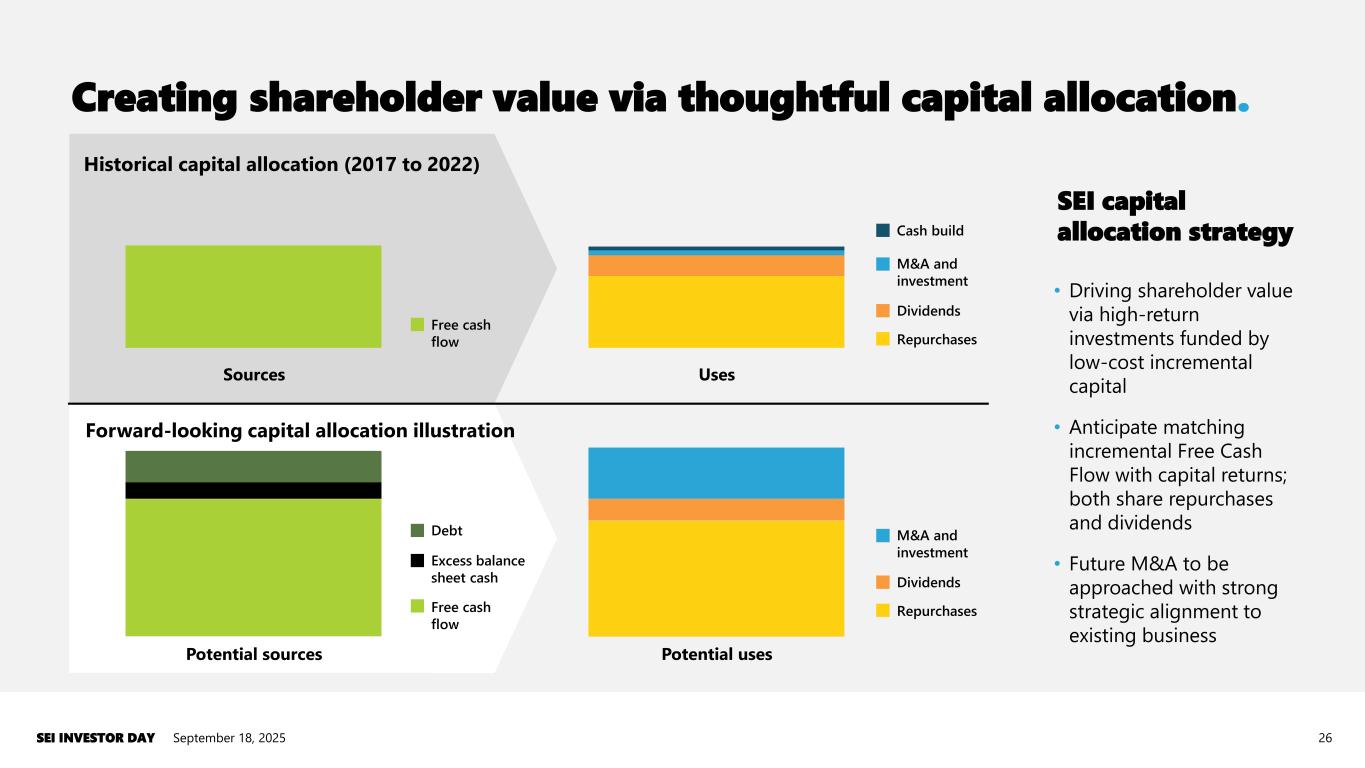 Creating shareholder value via thoughtful capital allocation. September 18, 2025SEI INVESTOR DAY 25 Historical capital allocation (2017 to 2022) Free cash flow Cash build M&A and Investment Dividends Repurchases Sources Uses