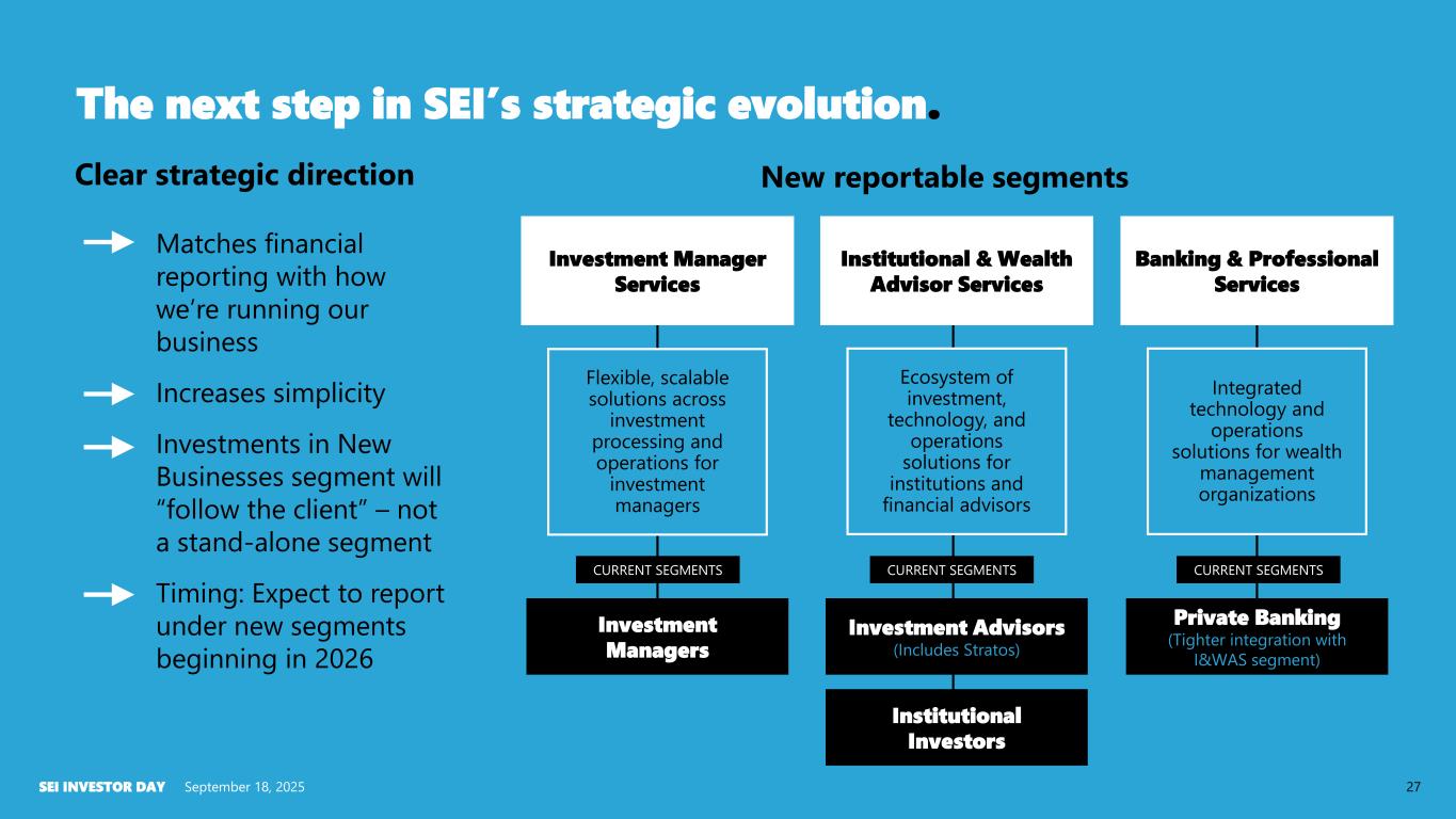 The next step in SEI’s strategic evolution. New reportable segments September 18, 2025SEI INVESTOR DAY 27 Matches financial reporting with how we’re running our business Increases simplicity Investments in New Businesses segment will “follow the client” – not a stand-alone segment Timing: Expect to report under new segments beginning in 2026 Clear strategic direction Investment Manager Services Flexible, scalable solutions across investment processing and operations for investment managers Investment Managers Institutional & Wealth Advisor Services Ecosystem of investment, technology, and operations solutions for institutions and financial advisors Investment Advisors (Includes Stratos) Institutional Investors CURRENT SEGMENTSCURRENT SEGMENTS Banking & Professional Services Integrated technology and operations solutions for wealth management organizations Private Banking (Tighter integration with I&WAS segment) CURRENT SEGMENTS