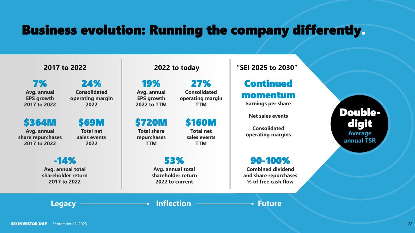 SEI INVESTOR DAY September 18, 2025 Business evolution: Running the company differently. 28 Legacy Inflection Future 7% Avg. annual EPS growth 2017 to 2022 24% Consolidated operating margin 2022 $364M Avg. annual share repurchases 2017 to 2022 $69M Total net sales events 2022 -14% Avg. annual total shareholder return 2017 to 2022 19% Avg. annual EPS growth 2022 to TTM 27% Consolidated operating margin TTM $720M Total share repurchases TTM $160M Total net sales events TTM 53% Avg. annual total shareholder return 2022 to current Continued momentum Earnings per share Net sales events Consolidated operating margins 90-100% Combined dividend and share repurchases % of free cash flow 2017 to 2022 2022 to today “SEI 2025 to 2030” Double- digit Average annual TSR
