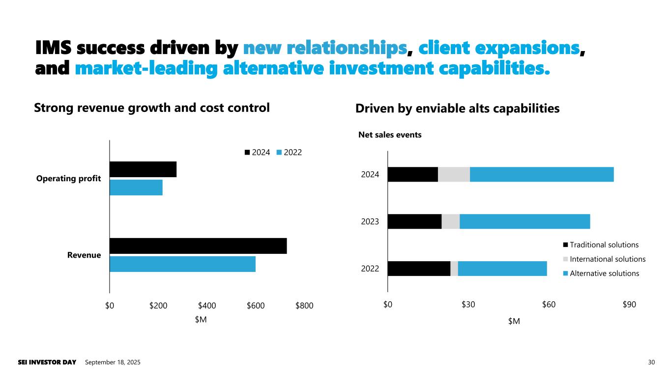 IMS success driven by new relationships, client expansions, and market-leading alternative investment capabilities. September 18, 2025SEI INVESTOR DAY 30 Strong revenue growth and cost control Driven by enviable alts capabilities $0 $200 $400 $600 $800 Revenue Operating profit $M 2024 2022 $0 $30 $60 $90 2022 2023 2024 $M Net sales events Traditional solutions International solutions Alternative solutions
