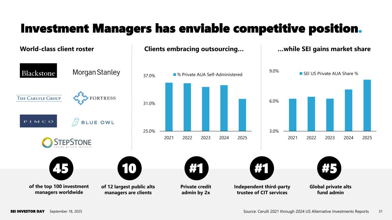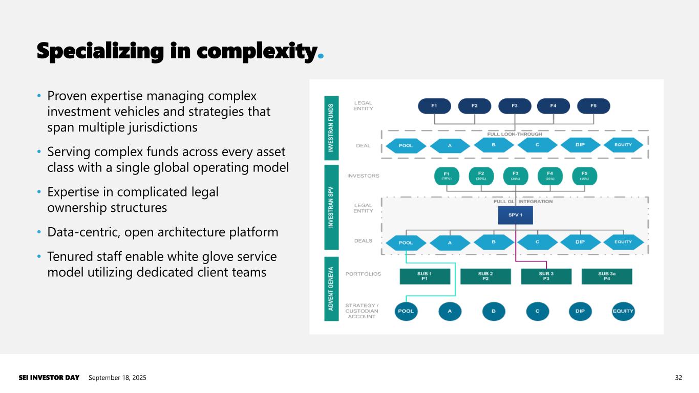 Investment Managers has enviable competitive position. September 18, 2025SEI INVESTOR DAY 31 World-class client roster Clients embracing outsourcing… 25.0% 31.0% 37.0% 2021 2022 2023 2024 2025 % Private AUA Self-Administered 3.0% 6.0% 9.0% 2021 2022 2023 2024 2025 SEI US Private AUA Share % of the top 100 investment managers worldwide of 12 largest public alts managers are clients Private credit admin by 2x Independent third-party trustee of CIT services Global private alts fund admin …while SEI gains market share 45 10 #1 #1 #5 Source: Cerulli 2021 through 2024 US Alternative Investments Reports