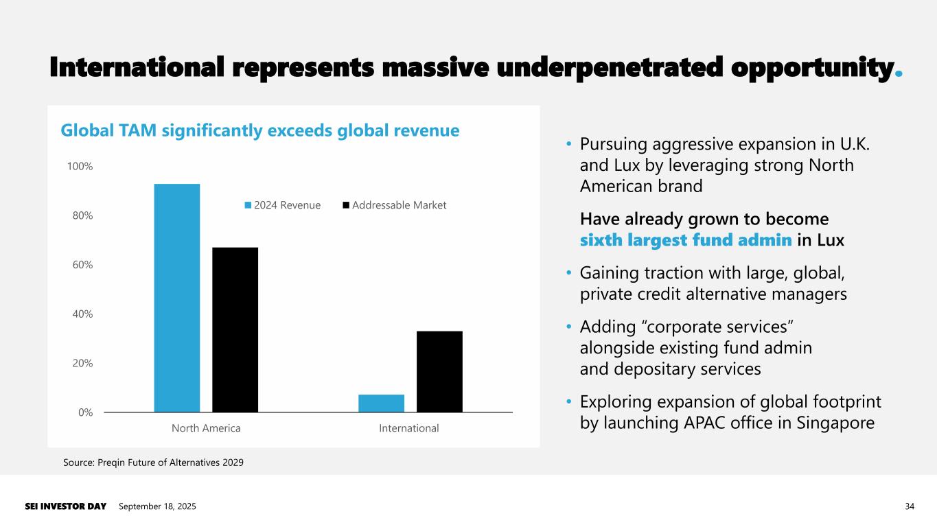 International expansion • <10% of 2024 revenue from global despite non-U.S. markets, representing ~33% of TAM • Pursuing aggressive expansion in U.K., Lux and Singapore by leveraging strong North American brand Growth from “land and expand” • Areas of strongest alternative market growth coincide with SEI’s relative strengths • SEI positioning to benefit from continued industry trends: ▪ Retailization of alts ▪ Acceptance of alts in U.S. retirement plans Positioning for changing industry landscape • “Land and Expand” clients have driven recent growth via significant wallet share increases • Substantial room remains to expand within “land and expand” alternative clients September 18, 2025SEI INVESTOR DAY 33 Where we’re going.