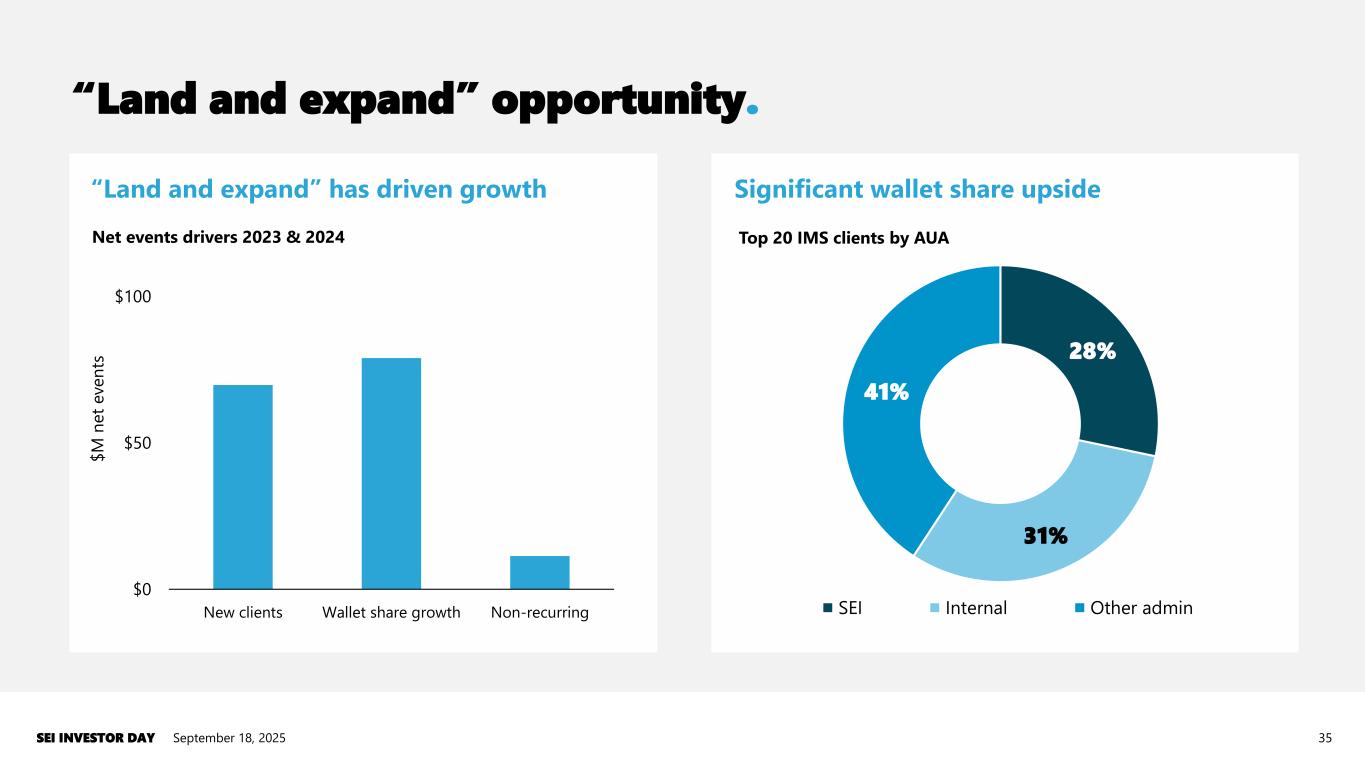 “Land and expand” opportunity. September 18, 2025SEI INVESTOR DAY 35 “Land and expand” has driven growth $0 $50 $100 New clients Wallet share growth Non-recurring $ M n e t e v e n ts Net events drivers 2023 & 2024 Significant wallet share upside 28% 31% 41% Top 20 IMS clients by AUA SEI Internal Other admin