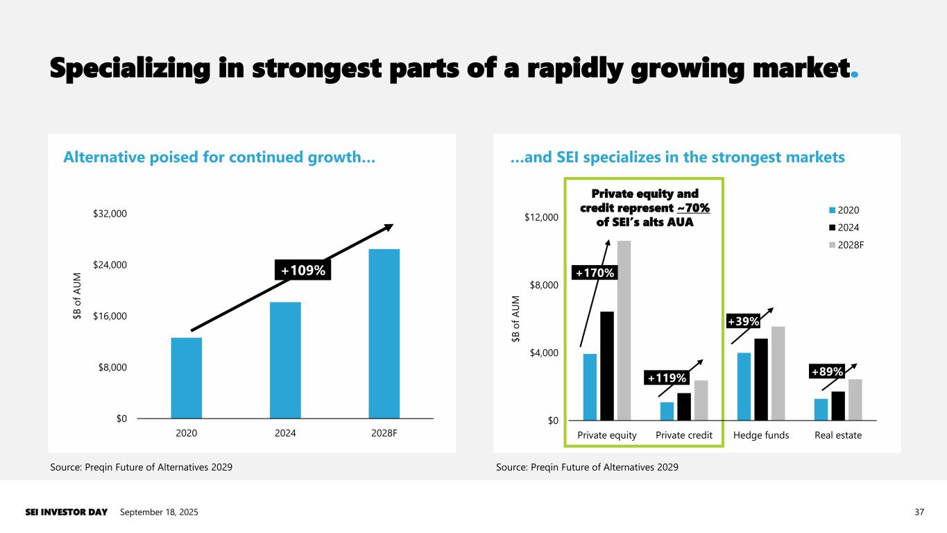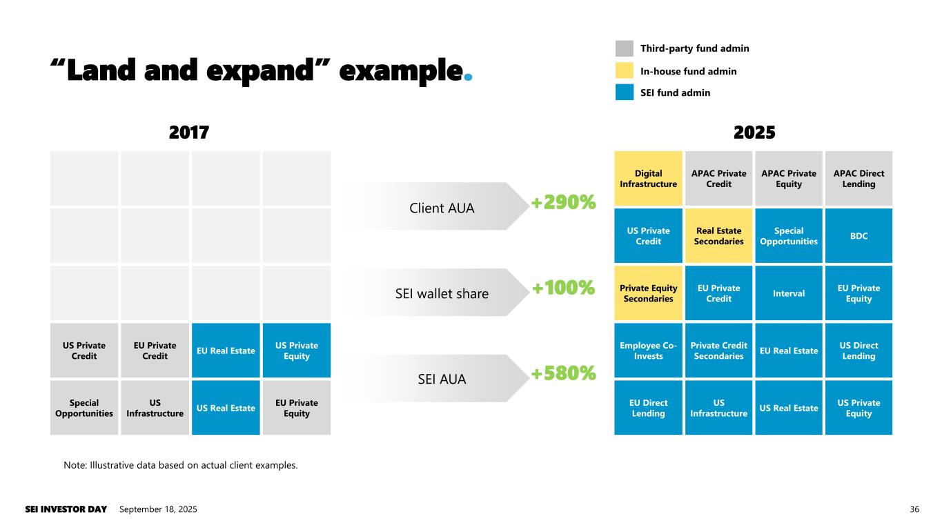 “Land and expand” example. September 18, 2025SEI INVESTOR DAY 36 US Private Credit EU Private Credit EU Real Estate US Private Equity Special Opportunities US Infrastructure US Real Estate EU Private Equity Digital Infrastructure APAC Private Credit APAC Private Equity APAC Direct Lending US Private Credit Real Estate Secondaries Special Opportunities BDC Private Equity Secondaries EU Private Credit Interval EU Private Equity Employee Co- Invests Private Credit Secondaries EU Real Estate US Direct Lending EU Direct Lending US Infrastructure US Real Estate US Private Equity Client AUA +290% SEI wallet share +100% SEI AUA +580% 2017 2025 SEI fund admin Third-party fund admin In-house fund admin Note: Illustrative data based on actual client examples.
