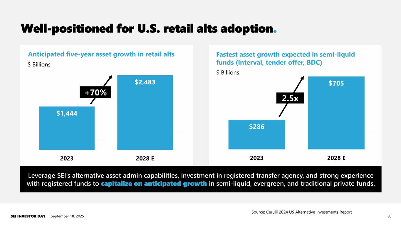 Specializing in strongest parts of a rapidly growing market. September 18, 2025SEI INVESTOR DAY 37 Alternative poised for continued growth… …and SEI specializes in the strongest markets $0 $8,000 $16,000 $24,000 $32,000 2020 2024 2028F $ B o f A U M +109% $0 $4,000 $8,000 $12,000 Private equity Private credit Hedge funds Real estate $ B o f A U M 2020 2024 2028F +119% +89% Private equity and credit represent ~70% of SEI’s alts AUA +170% +39% Source: Preqin Future of Alternatives 2029 Source: Preqin Future of Alternatives 2029