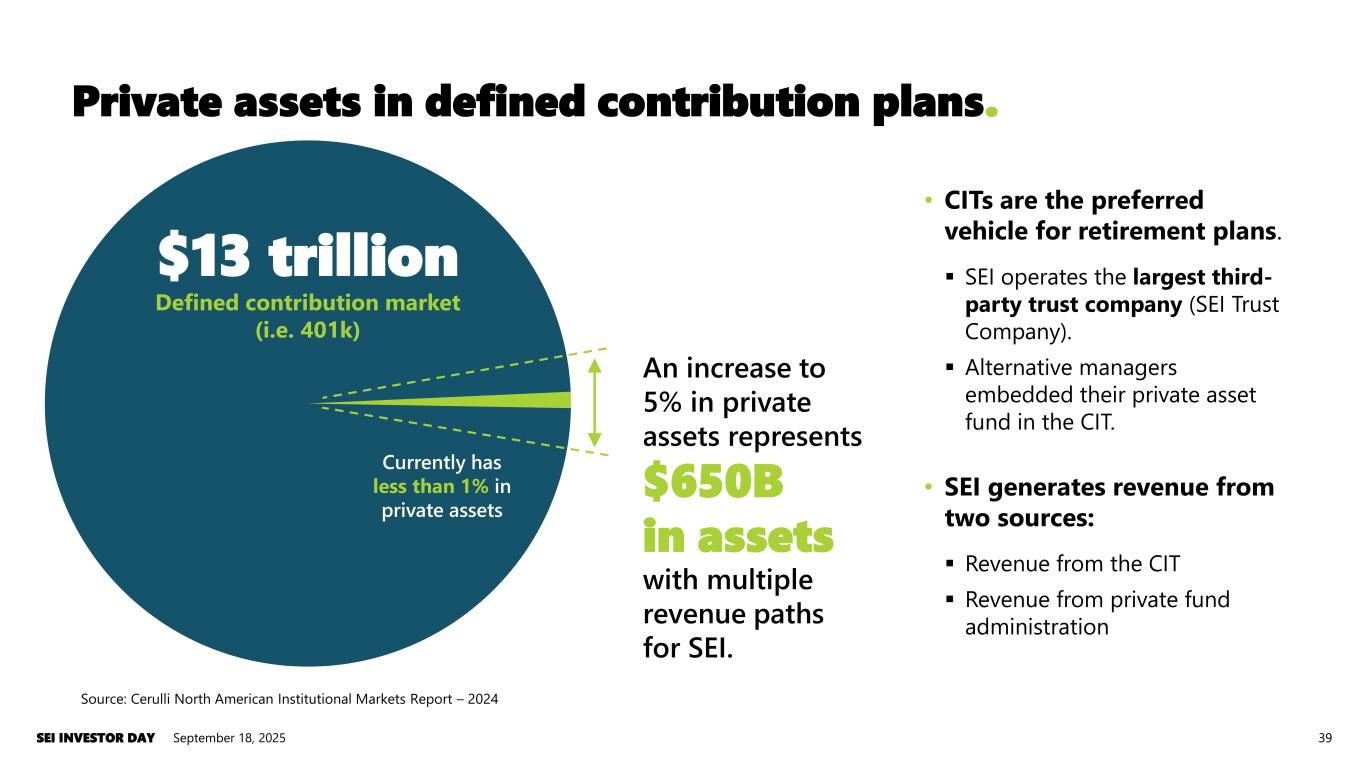 $13 trillion Defined contribution market (i.e. 401k) An increase to 5% in private assets represents $650B in assets with multiple revenue paths for SEI. • CITs are the preferred vehicle for retirement plans. ▪ SEI operates the largest third- party trust company (SEI Trust Company). ▪ Alternative managers embedded their private asset fund in the CIT. • SEI generates revenue from two sources: ▪ Revenue from the CIT ▪ Revenue from private fund administration Private assets in defined contribution plans. September 18, 2025SEI INVESTOR DAY 39 Currently has less than 1% in private assets Source: Cerulli North American Institutional Markets Report – 2024