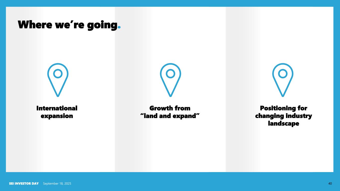September 18, 2025SEI INVESTOR DAY 40 Where we’re going. International expansion Growth from “land and expand” Positioning for changing industry landscape
