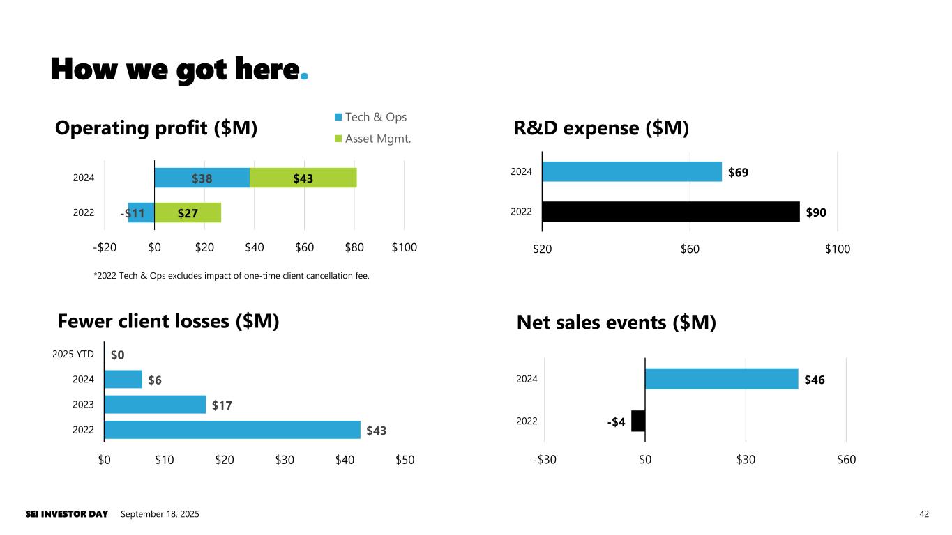 $90 $69 $20 $60 $100 2022 2024 R&D expense ($M) -$4 $46 -$30 $0 $30 $60 2022 2024 Net sales events ($M) How we got here. September 18, 2025SEI INVESTOR DAY 42 $43 $17 $6 $0 $0 $10 $20 $30 $40 $50 2022 2023 2024 2025 YTD Fewer client losses ($M) -$11 $38 $27 $43 -$20 $0 $20 $40 $60 $80 $100 2022 2024 Operating profit ($M) Tech & Ops Asset Mgmt. *2022 Tech & Ops excludes impact of one-time client cancellation fee.