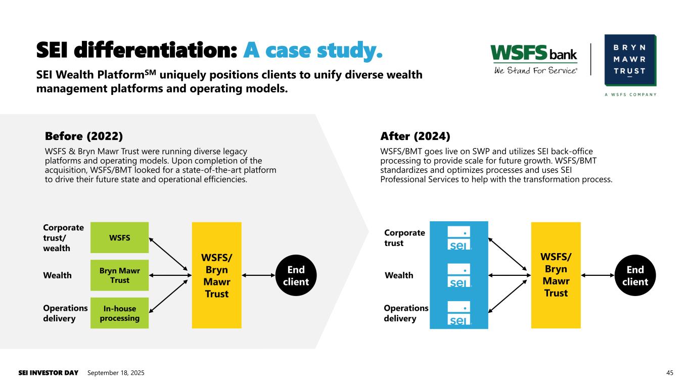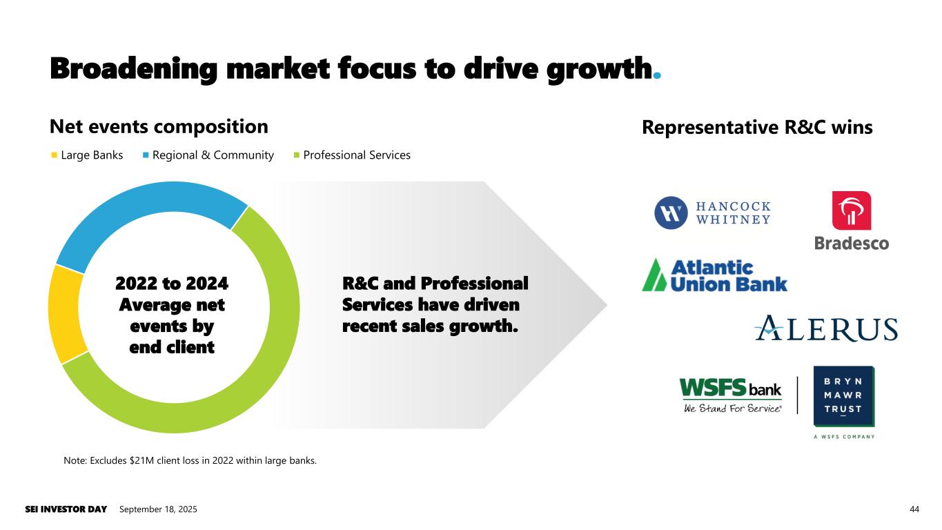 Representative R&C wins R&C and Professional Services have driven recent sales growth. Broadening market focus to drive growth. September 18, 2025SEI INVESTOR DAY 44 Net events composition Large Banks Regional & Community Professional Services Note: Excludes $21M client loss in 2022 within large banks. 2022 to 2024 Average net events by end client