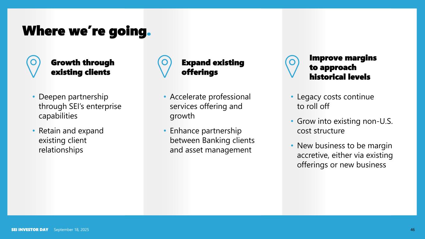 Before (2022) WSFS & Bryn Mawr Trust were running diverse legacy platforms and operating models. Upon completion of the acquisition, WSFS/BMT looked for a state-of-the-art platform to drive their future state and operational efficiencies. SEI differentiation: A case study. September 18, 2025SEI INVESTOR DAY 45 SEI Wealth PlatformSM uniquely positions clients to unify diverse wealth management platforms and operating models. After (2024) WSFS/BMT goes live on SWP and utilizes SEI back-office processing to provide scale for future growth. WSFS/BMT standardizes and optimizes processes and uses SEI Professional Services to help with the transformation process. WSFS/ Bryn Mawr Trust End client WSFS Corporate trust/ wealth Wealth Operations delivery Bryn Mawr Trust In-house processing WSFS/ Bryn Mawr Trust End client Corporate trust Wealth Operations delivery