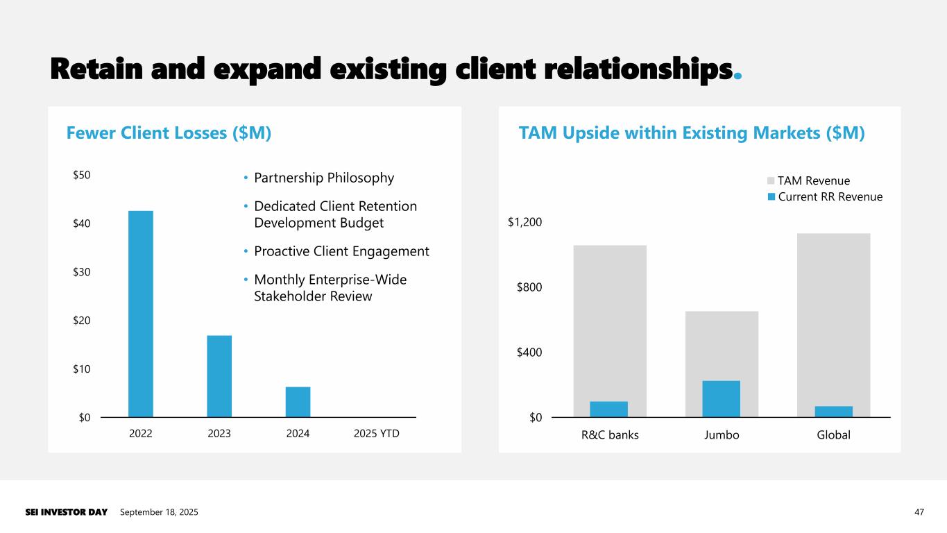 Growth through existing clients Expand existing offerings Improve margins to approach historical levels September 18, 2025SEI INVESTOR DAY 46 Where we’re going. • Deepen partnership through SEI’s enterprise capabilities • Retain and expand existing client relationships • Legacy costs continue to roll off • Grow into existing non-U.S. cost structure • New business to be margin accretive, either via existing offerings or new business • Accelerate professional services offering and growth • Enhance partnership between Banking clients and asset management