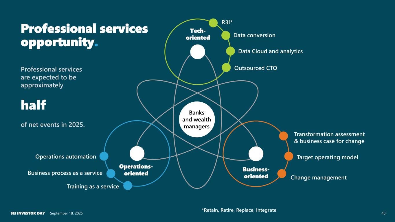 48 Professional services are expected to be approximately half of net events in 2025. R3I* Tech- oriented Operations- oriented Business- oriented Data conversion Outsourced CTO Data Cloud and analytics Operations automation Business process as a service Training as a service Target operating model Change management Banks and wealth managers September 18, 2025SEI INVESTOR DAY Professional services opportunity. Transformation assessment & business case for change *Retain, Retire, Replace, Integrate