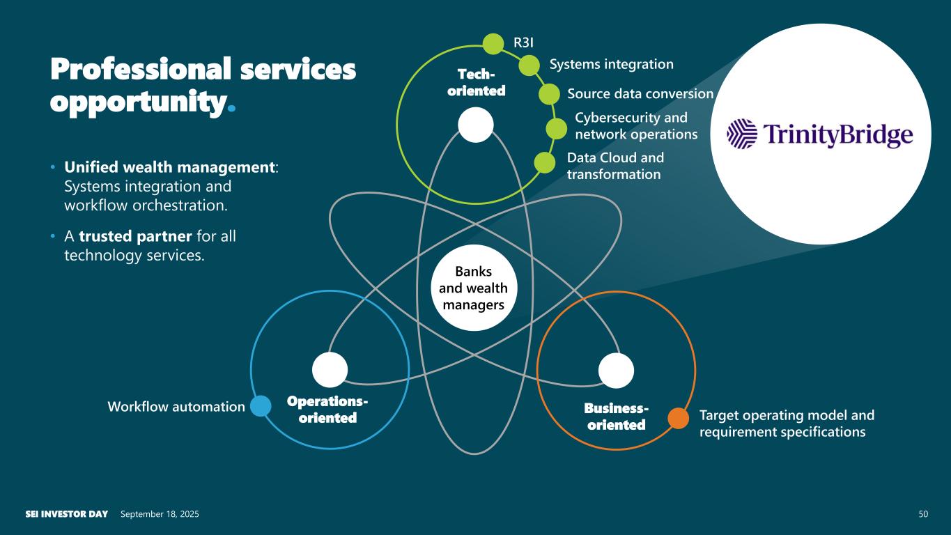 49 Tech- oriented Operations- oriented Business- oriented Data transformation Business readiness Data Cloud and analytics Business processes training Banks and wealth managers Professional services opportunity. September 18, 2025SEI INVESTOR DAY Target operating modelWorkflow assessment and optimization Solution consulting• Production readiness and assist with people, process, and technology change journey. • Post-live solution consulting, technology, and operations services.