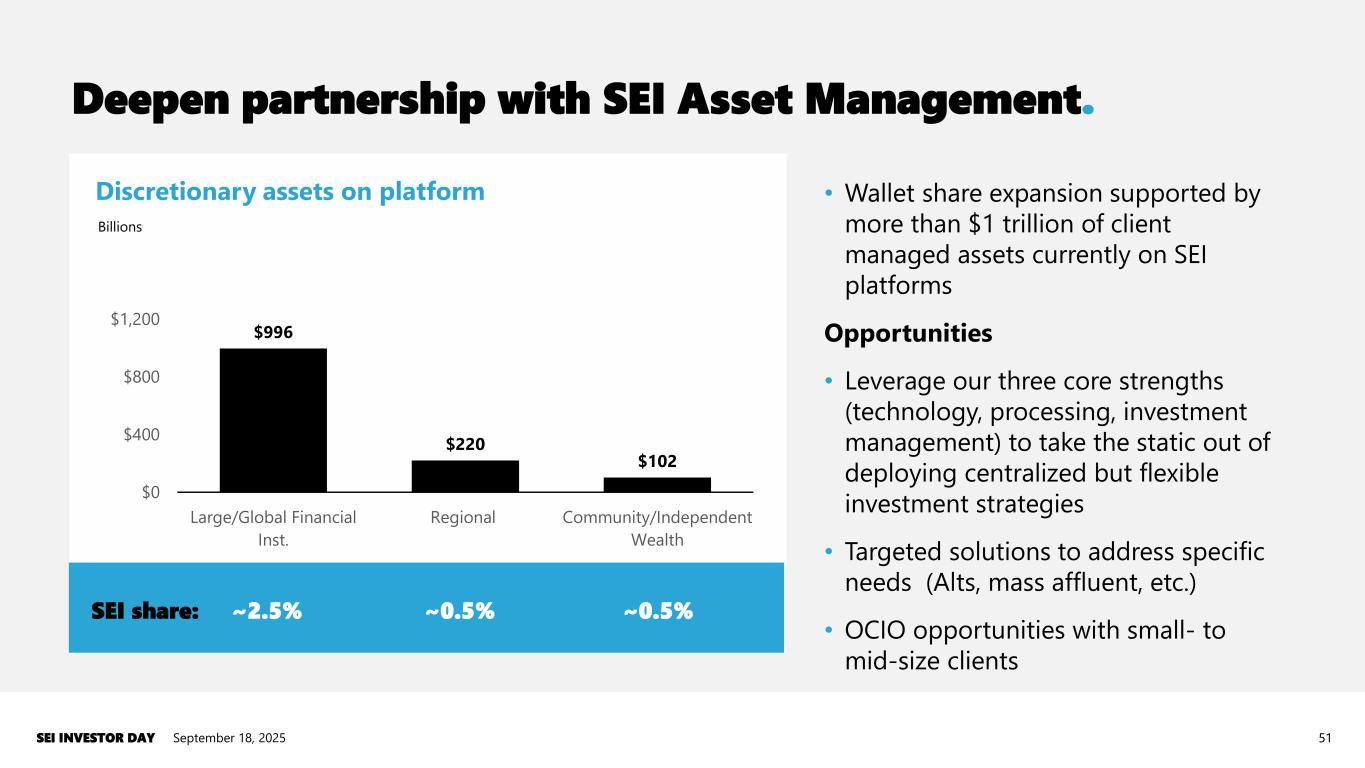 50 R3I Tech- oriented Operations- oriented Business- oriented Source data conversion Target operating model and requirement specifications Banks and wealth managers September 18, 2025SEI INVESTOR DAY Cybersecurity and network operations Workflow automation Data Cloud and transformation Systems integration • Unified wealth management: Systems integration and workflow orchestration. • A trusted partner for all technology services. Professional services opportunity.