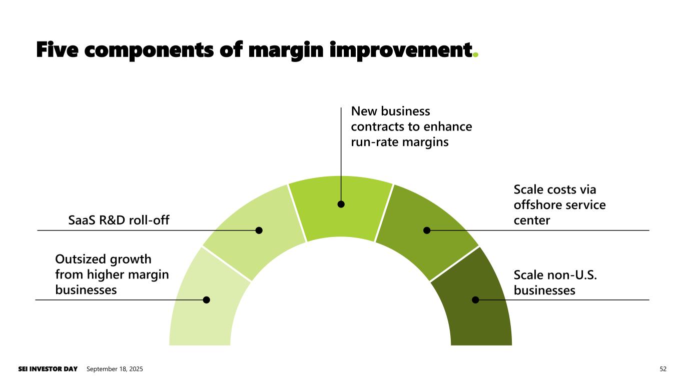 Five components of margin improvement. September 18, 2025SEI INVESTOR DAY 52 SaaS R&D roll-off Outsized growth from higher margin businesses New business contracts to enhance run-rate margins Scale costs via offshore service center Scale non-U.S. businesses