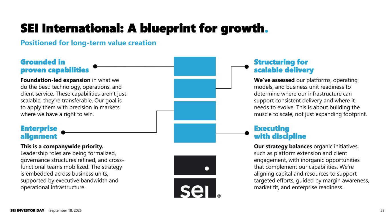 Grounded in proven capabilities Foundation-led expansion in what we do the best: technology, operations, and client service. These capabilities aren’t just scalable, they’re transferable. Our goal is to apply them with precision in markets where we have a right to win. Enterprise alignment This is a companywide priority. Leadership roles are being formalized, governance structures refined, and cross- functional teams mobilized. The strategy is embedded across business units, supported by executive bandwidth and operational infrastructure. Structuring for scalable delivery We’ve assessed our platforms, operating models, and business unit readiness to determine where our infrastructure can support consistent delivery and where it needs to evolve. This is about building the muscle to scale, not just expanding footprint. Executing with discipline Our strategy balances organic initiatives, such as platform extension and client engagement, with inorganic opportunities that complement our capabilities. We’re aligning capital and resources to support targeted efforts, guided by margin awareness, market fit, and enterprise readiness. SEI International: A blueprint for growth. September 18, 2025SEI INVESTOR DAY 53 Positioned for long-term value creation